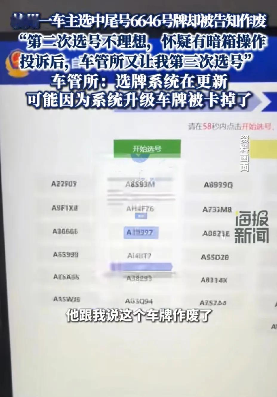 杭州,男子去车管所选车牌号,他一眼选中尾号6646号牌后,顺眼又好记,可当他提交