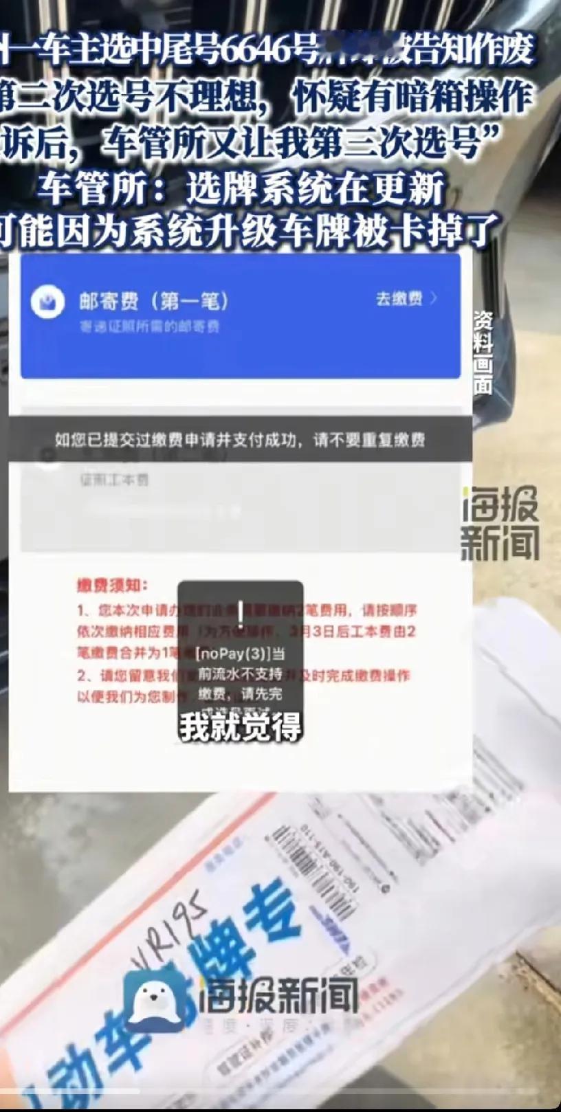 杭州,男子去车管所选车牌号,他一眼选中尾号6646号牌后,顺眼又好记,可当他提交缴费时。却被告知作废,需要重新选号,男子第二次选号,没看到中意的号牌。回去后,男子觉得不对劲,他怀疑工作人员暗箱操作,车管所又让男子第三次选号。记者采访时,车管所的回答让人意外。 史先生揣着刚提车的雀跃,他去车管所选车牌号,一路上暗暗祈祷自己一定要选个如意的号码。 在他眼里,车号码不求多靓,顺眼好记就行。 说来也巧,车管所放出来的号码,史先生第一眼就看上了一组号码。 “6646”四个数字像长了眼睛似的,一下撞进史先生眼里。 前两位“66”讨喜,尾号“46”读着顺口,连起来既不拗口又有辨识度,史先生没半点犹豫,当即点了确认,嘴角的笑意就没下来过。 史先生兴高采烈,觉得今天真是个好日子,让他选到又顺眼又好记的号码,准备缴费制牌时。 不料,系统竟然弹窗提示:当前流水尚未完成选号,请稍后再试。 工作人员随后告知他,号码作废,需要重选一次。 史先生有些由喜转悲。他急得拿出手机翻刚才截的屏,说怎么就作废了?我明明确认成功了啊! 工作人员解释,网络延迟导致数据卡顿,你的选号操作没被完全记录。系统没同步上,只能再走一次选号流程。 人果然不能高兴得太早。 史先生满心欢喜被泼了冷水,他蔫蔫地回到选号机前。 可这次滚动的号码不是带一堆生僻数字,就是尾号杂乱无章,翻来覆去没一个能比得上“6646”。 他越选越烦躁,最后勉强挑了一组,盯着屏幕看了半分钟,还是不甘心地放弃了。 因为这事,史先生越想越不对劲,为什么偏偏是他的号码作废?回去后他饭也吃不下,睡也睡不好,他怀疑车管所暗箱操作,决定要个说法,就将此事投诉。 投诉后,车管所同意让史先生第三次选号。这次的选车牌费是车管所承担。 史先生这一次选到尾号是4545,他对于处理结果还是比较满意的。 记者采访时,车管所工作人员回应:当时选号系统正进行后台升级维护,数据同步出现短暂延迟,才导致史先生选中的‘6646’号牌未被系统完整记录,并非人为操作或暗箱操作。 对于史先生的质疑,其表示完全理解,“换谁选中心仪号码又作废都会着急,所以第一时间协调了第三次选号并承担费用,后续会优化升级流程,避开业务高峰时段更新系统。 有网友说,4545也挺顺的,车管所给第三次机会还包费用,处理态度算诚恳了,但系统bug确实该提前排查,不然多影响心情。  有网友认为,之前我也遇到过选号卡顿,还好没选到心仪的,真要是好号被作废,换谁都得怀疑!建议选号时多录视频留证。 那么,从法律角度,如何看待此事呢? 1、史先生质疑车管所暗箱操作,是在行使监督权利。 《宪法》第41条规定:中华人民共和国公民对于任何国家机关和国家工作人员,有提出批评和建议的权利;对于任何国家机关和国家工作人员的违法失职行为,有向有关国家机关提出申诉、控告或者检举的权利,但是不得捏造或者歪曲事实进行诬告陷害。 史先生对“暗箱操作”的质疑,本质上是对选号流程是否符合“公开公平”法定原则的监督,这也是公民维护自身权益的合法诉求。 《机动车登记规定》第43条规定:机动车所有人可通过随机选取或自行编排方式确定号牌号码,且公安机关交通管理部门必须使用统一的选号系统发放号牌,所有号牌需公开向社会发放。 号牌资源属于公共资源,不得通过人工筛选、预留或定向分配等方式处置,从制度层面否定了“暗箱操作”的合法性。 2、车管所以“网络延迟、数据卡顿”为由认定号牌作废,需承担相应的服务瑕疵责任。 《行政许可法》第69条规定:因行政机关自身过错,如系统未及时维护、升级未保障数据同步,导致行政许可流程异常的,行政机关应主动采取补救措施。 此次车管所为史先生协调第三次选号机会并承担选号费用,正是对“服务瑕疵”的补救体现,符合“合理行政、权责统一”的行政法原则。 3、车主也要保存好维权证据。 《行政诉讼法》第33条规定:证据包括:(一)书证;(二)物证;(三)视听资料;(四)电子数据;(五)证人证言;(六)当事人的陈述;(七)鉴定意见;(八)勘验笔录、现场笔录。以上证据经法庭审查属实,才能作为认定案件事实的根据。 在选号流程中,若再次出现“选号成功后被作废”的情况,车主可凭视频、截图等证据,为维权提供支撑。 对此,你怎么看?