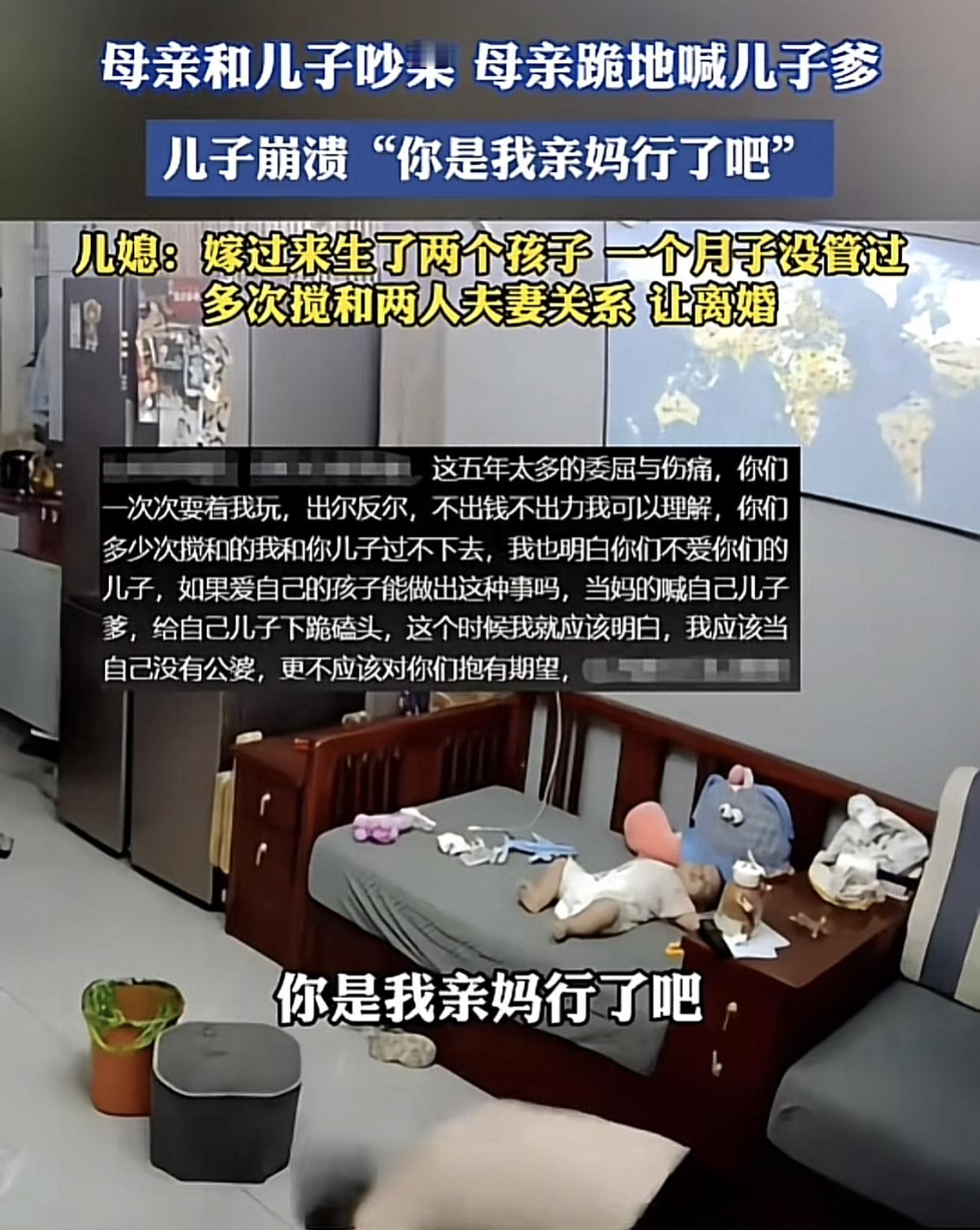 成年人的崩溃只在一瞬间。刷到网友发布了一段母亲和儿子争吵的视频。视频中,一位母亲与儿子发生争吵,儿子蜷缩在沙发上,没心情吃饭,母亲觉得丈夫翅膀硬了敢甩脸子了,于是故意说了一句“行了吧,爹”来刺激儿子。 儿子听到这件话后终于忍无可忍,把手里东西砸到地上,发出绝望吼叫,质问母亲:“你是不是要逼s我?你为什么叫我爹?怎么就叫我爹了?”。旁边两孩子吓得嚎啕大哭,儿媳满脸心疼拉住丈夫安慰他。 然而等儿子好不容易心情平复下来,这位母亲又开始作妖,跪在地上给儿子磕头,边磕头边哭,说儿子不孝顺,儿媳见状立马过去拉婆婆起来。 儿子见到这一幕显得极为崩溃,随后对着母亲磕头,嘴里接连喊着“你是我亲妈行了吧”,最后无奈说出“滚”字,求亲妈搬走,别再祸害他们一家了。 而此时这位母亲才慢悠悠从地上爬起来,得意的大喊,我才不搬走,要走是你们走。 而据知情者透露,矛盾的起因是母亲看不惯儿媳妇觉得在照顾两个孩子,整天无所事事,于是天天劝儿子离婚,这引发了儿子的不满。还有说法称,母亲闹腾着要回老家,儿子送她回来的路上出了车祸,之后母亲觉得儿子甩脸子,便故意喊儿子“爹”刺激他,导致儿子情绪彻底失控。 但是不管是什么原因,从这位母亲行云流水的演技令以及儿子绝望大吼可以看出这位母亲的行为有多么令人毛骨悚然,对她来说,儿子不过是可以随意操控的玩具对此你们怎么看?