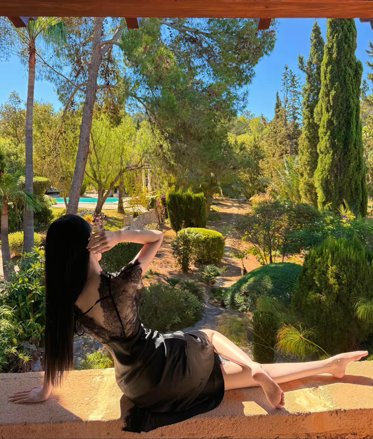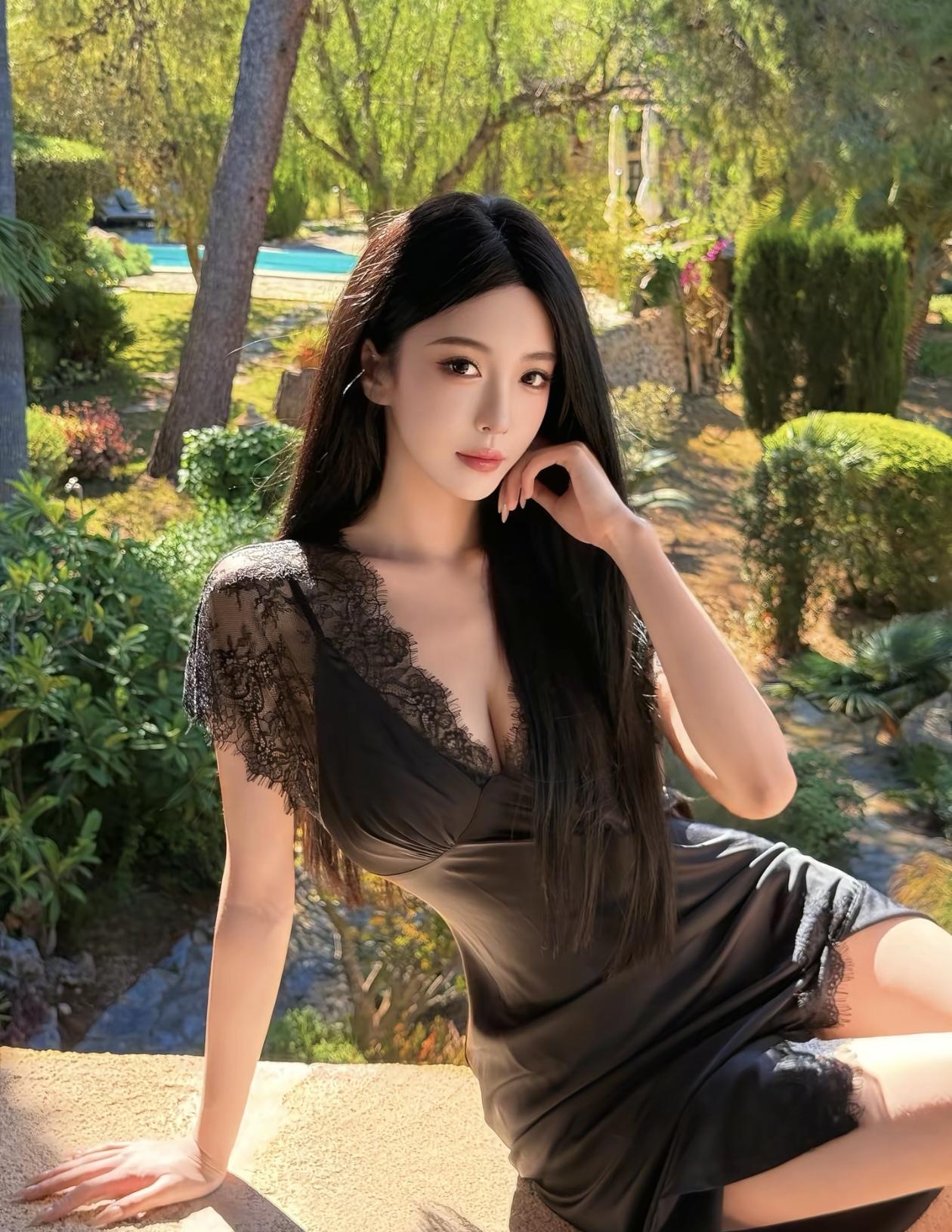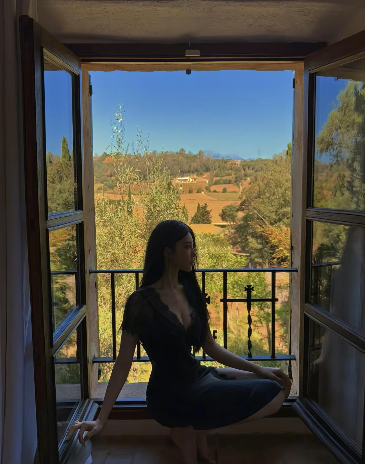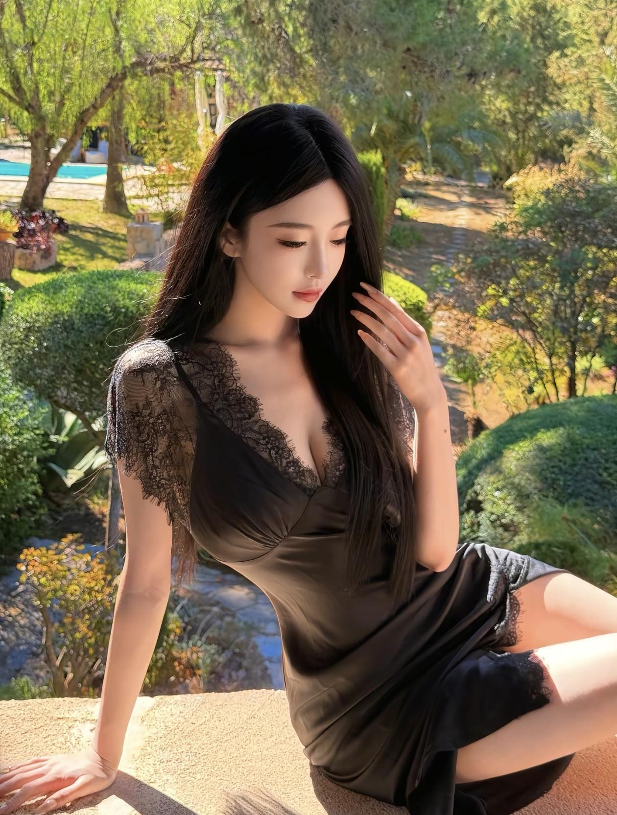 阳光洒在花园里,黑裙女子倚栏沉思,静享美好时光。