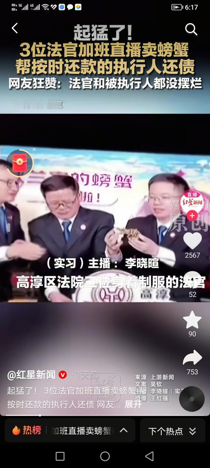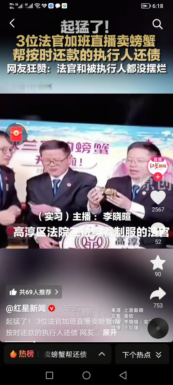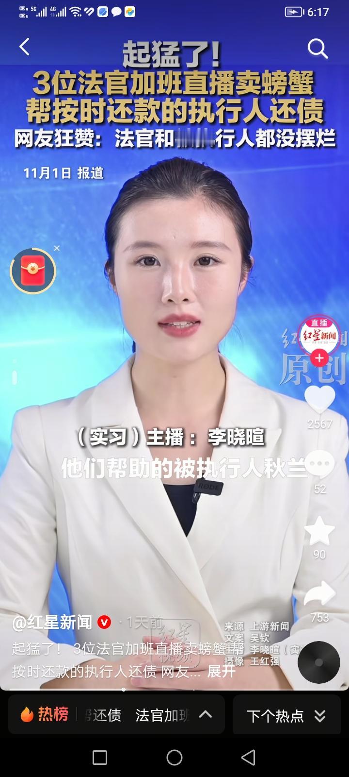 2025年10月31日晚,南京市高淳区人民法院三位法官在南京市中级人民法院视频号直播间,为债务人“秋兰家”的大闸蟹进行司法变卖直播带货 。 - 背景:秋兰父母因交通事故赔偿及养殖亏损,家庭债务最高达80多万元,2025年9月初提交“类个人破产”申请,法院认定其为“诚实而不幸”的债务人 。 - 直播情况:直播时长约2.5小时,吸引超20万人次围观,售出100多单,基本卖完当季成熟螃蟹 。 - 目的与资金流向:旨在通过资产处置(卖蟹)助力偿债,并结合普法;所有销售收入进入法院监管账户,专项用于该案债务清偿 。 - 说明:直播由执行团队加班筹备,未占用正常上班时间,是司法执行与司法为民的创新尝试 。 此次直播既帮助诚信债务人解决资金困难,又通过直播普及了“类个人破产”等法律知识,获得网友广泛点赞 。(图片信息来源:@红星新闻)直播 法院回应法官直播卖螃蟹 大闸蟹直播间 高淳大闸蟹批发