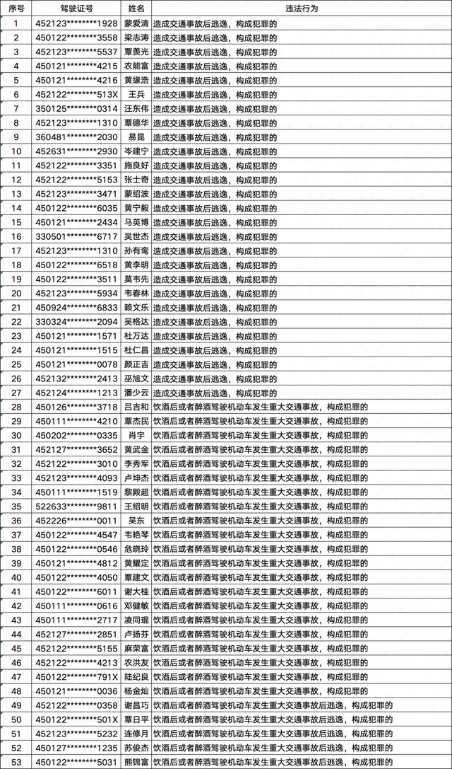 记者注意到,在这份终生禁驾人员名单中,蒙爱清、梁志涛等27人因造成交通事故后逃逸,构成犯罪被终生禁驾;吕吉和、覃杰民等26人饮酒后或者醉酒驾驶机动车发生交通事故,构成犯罪被终生禁驾。
