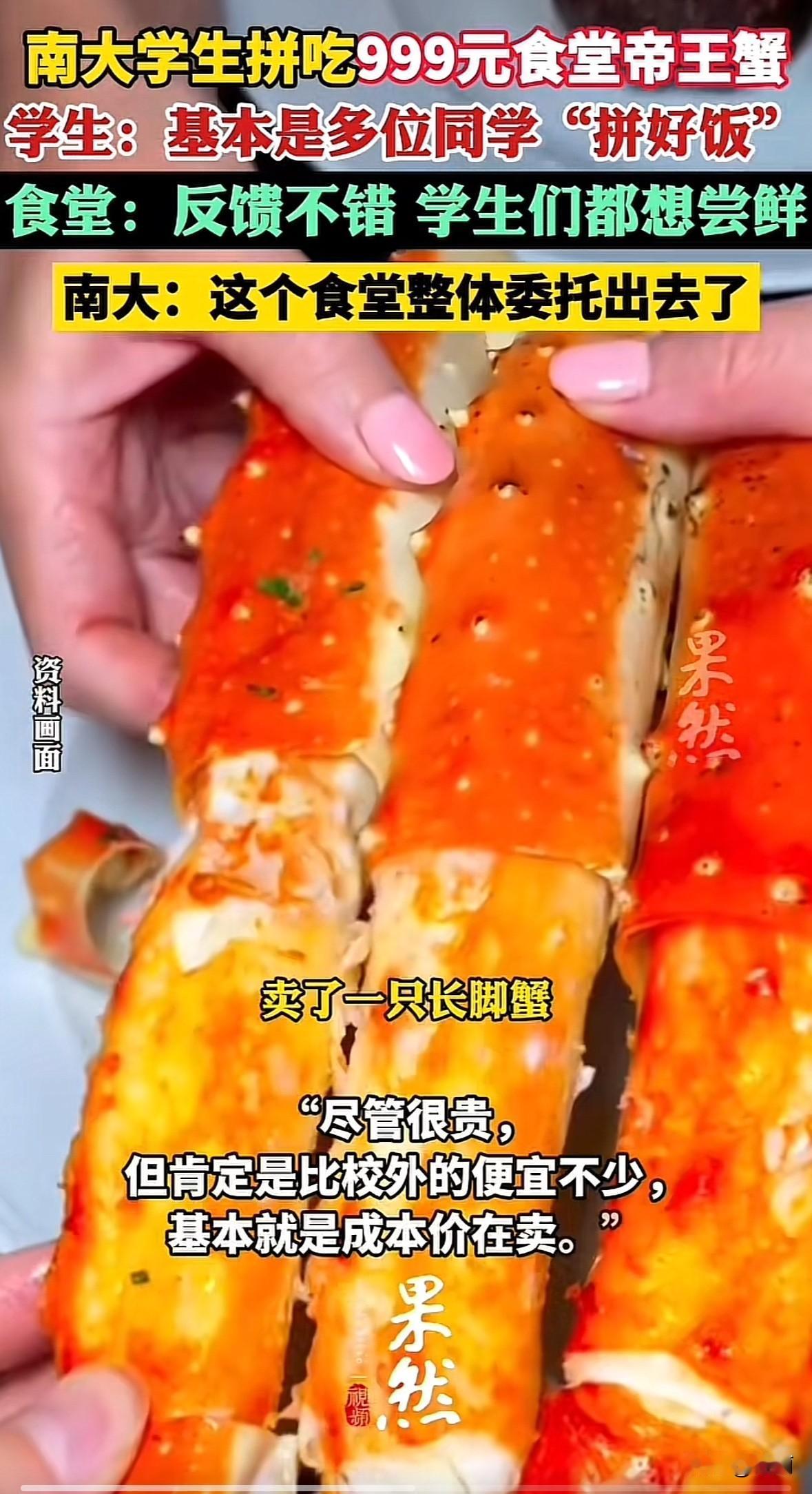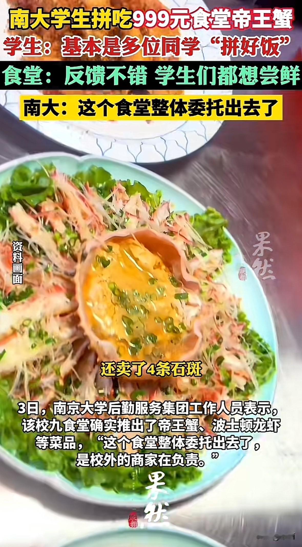 南京大学仙林校区第九食堂11月1日开了海鲜档口,卖999元一只的4.2斤帝王蟹,还有158元波士顿龙虾、10元生蚝等。学生们常拼单尝鲜,4人AA人均不到250,反馈食材新鲜、味道比校外餐厅好还便宜。 食堂说这是常规菜,不是应学生留言,每天只供一只可预订,加工免费。网友看法不一样,有人夸食堂贴心,能让学生平价吃高端海鲜;有人质疑高校食堂卖高价菜,会让普通家庭学生有压力。 其实食堂没取消平价选项,多一种选择不是坏事。学生拼的不只是帝王蟹,也是校园生活的新鲜感,只要守住普惠底线,食堂创新没必要过度指责。