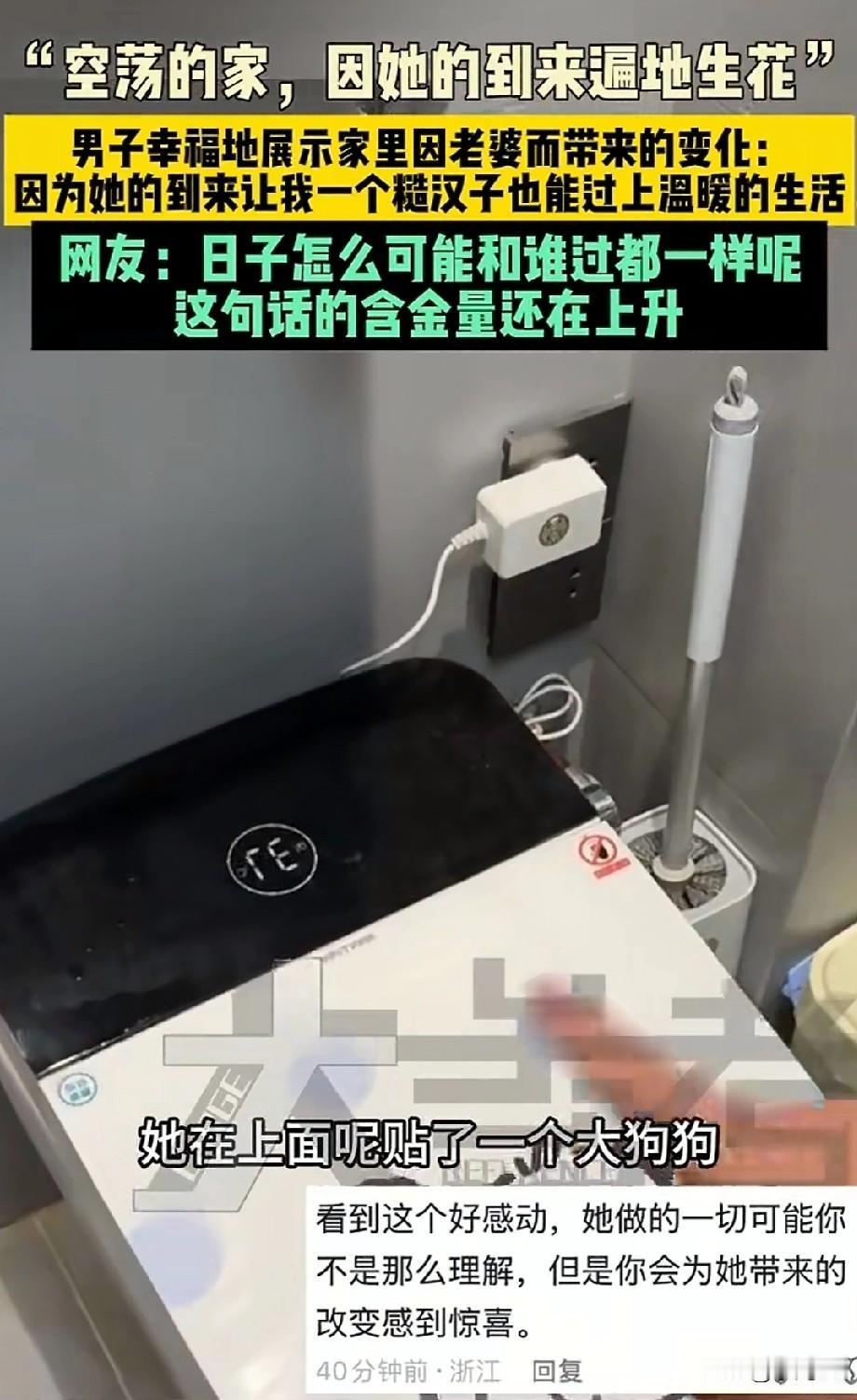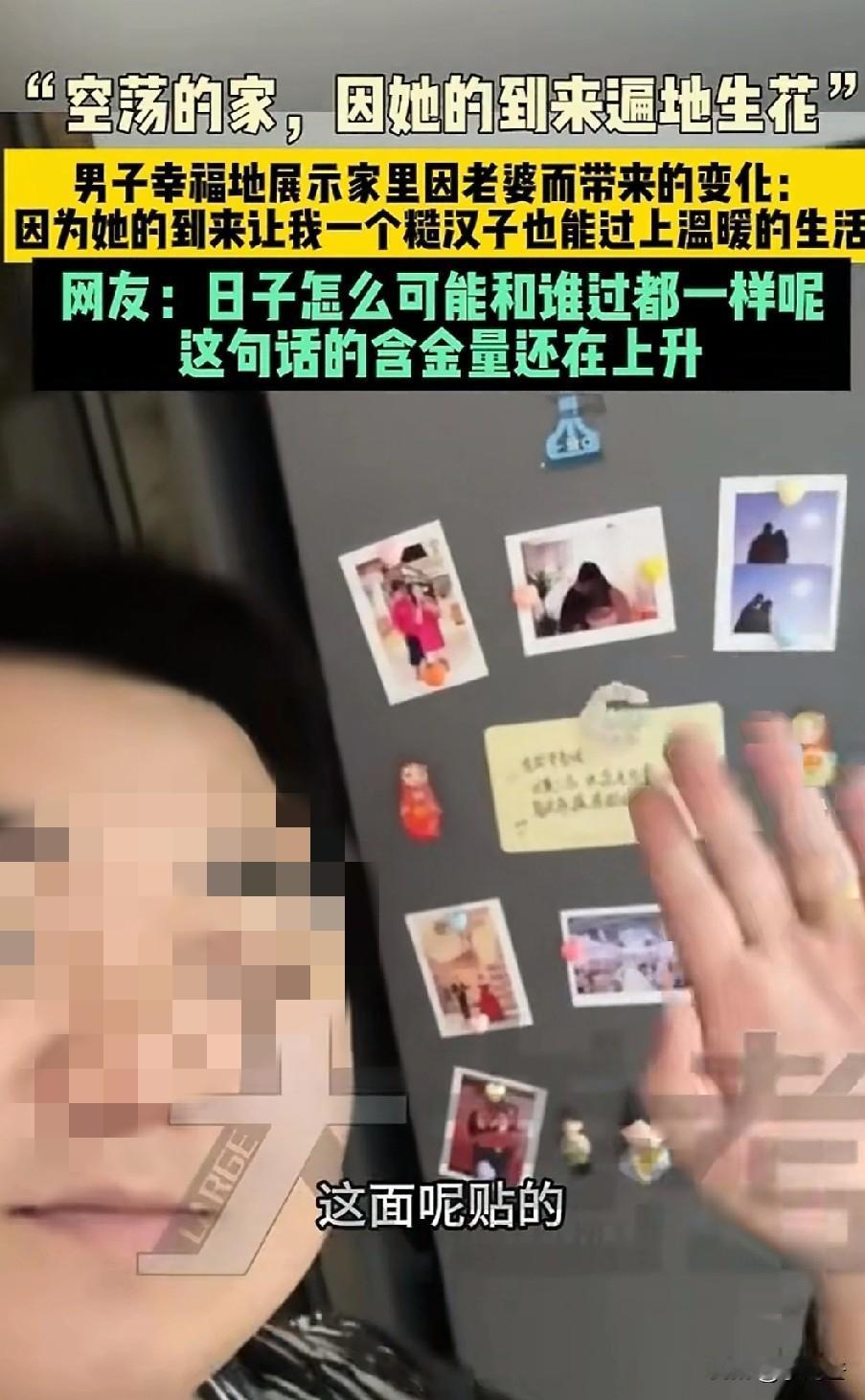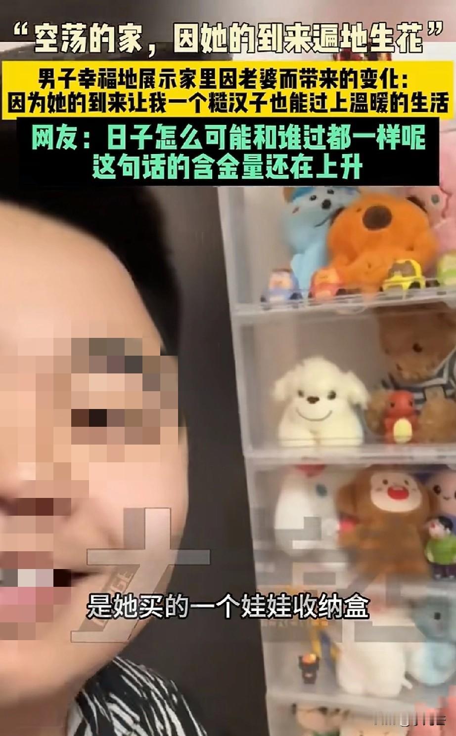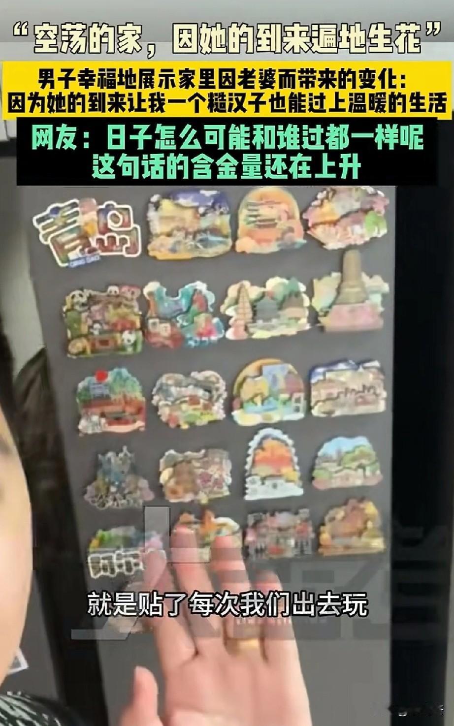 “单身的日子突然有了媳妇是什么感受!”山东一位男子说,自己媳妇搬了进来,家里真的遍地生花!一排娃娃收纳盒,看起来十分可爱,冰箱上一边贴着两人旅游的照片,另一边贴着各式各样的冰箱贴,还有卡通的叉子和土萌的牙签盒,甚至连马桶都贴上了大狗图案,随手的洗手液都是五彩的小茄子图案! 男子说,只有媳妇来了,才感觉糙汉子过上了精致的生活。媳妇来了,被单床单都是干净香喷喷的。 这个家只要有她在,就是温暖的,只要有她在,看着家里都是幸福的。所以媳妇的到来,对一个家庭来说就是遍地生花,天天都是好日子。 找个好队友就是幸福日子,找个猪队友,每天鸡飞狗跳。虽然是看起来非常没用的小东西,却是幸福感的体现。 所以爱要留给懂得人,一般的男人或许看见这些小东西也没有那么感慨,甚至连看都不会看它一眼,小娃娃、合照、冰箱贴、马桶贴,都是些细小琐碎的事情,是女孩子的爱好,但是他都一一感受到了变化,并觉得十分幸福。 所以说日子和谁过真的不一样,对的人会翻山越岭,奔赴山海,为你而来!