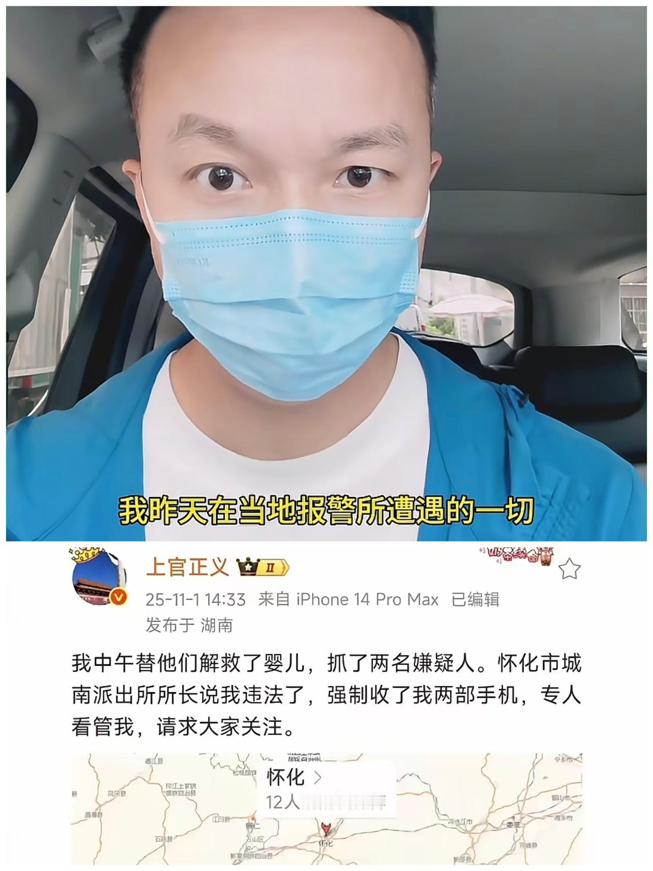 全国人民都在看着湖南怀化!!! 上官正义卧底数日掌握了fan卖婴儿团伙线索,向怀化方面举报,并协助解救3名婴儿,并抓获犯罪4名嫌疑人,怀化方面承认事情的真实性,并出了通报,却丝毫未提举报人当时在派出所内的遭遇,直到上官在网上发视频,要求他们给个说法,媒体纷纷报道我们才知道这几个小时发生了什么! 到底上官做错了什么呢? 上官说“当时被看管,一个光头叔叔吩咐人把他两部手机没收几个小时,连厕所都不让他去上”,这个派出所🔒长和ju长应该给上官一个交代! 如果都是这种态度对待举报人,以后谁还敢冒险做好事对吧? 现在全国人民都在看湖南怀化某些部门,一定要核查清楚,该处罚的处罚 希望不要寒了上官英雄的心!