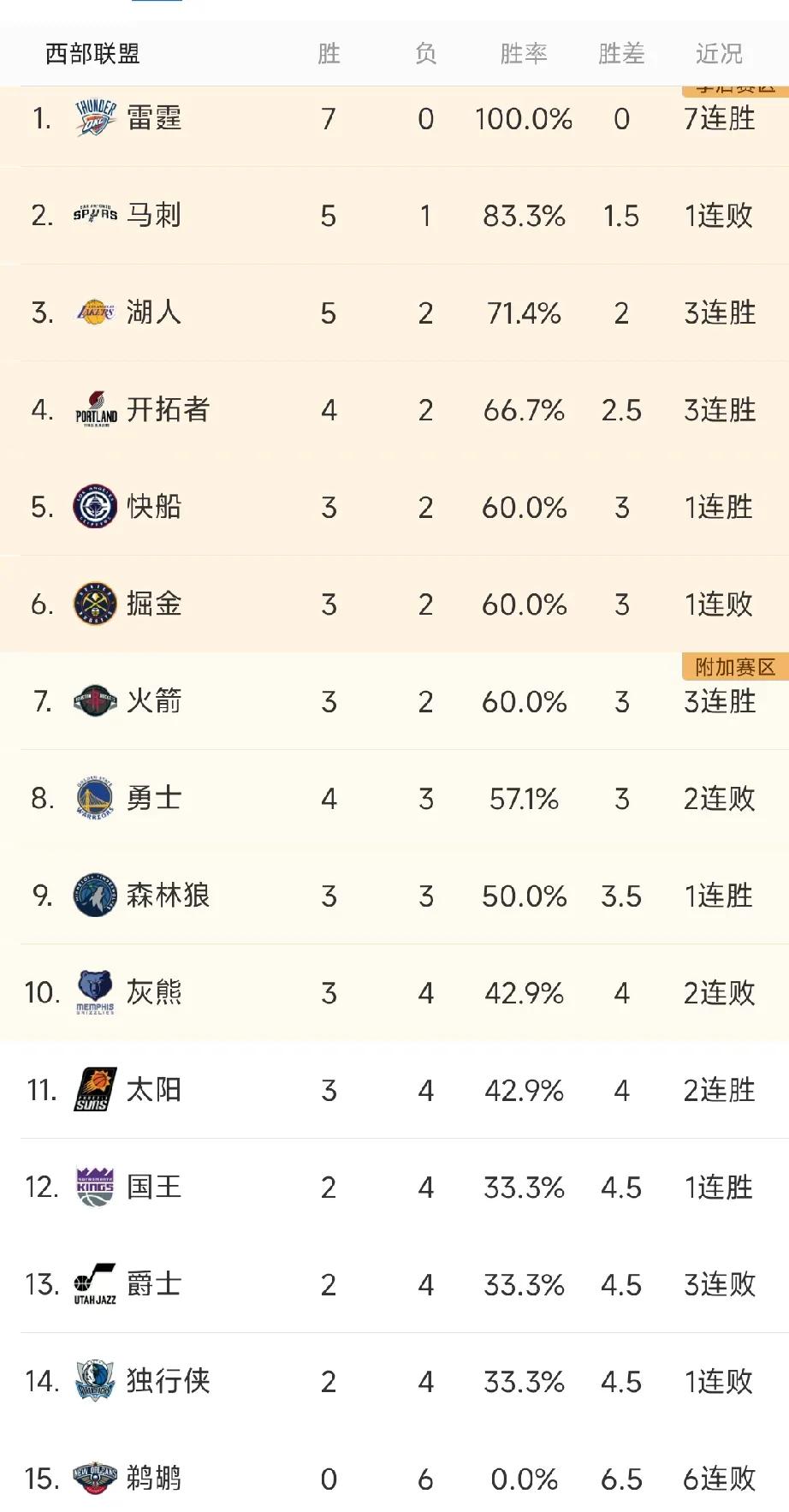NBA11月3日最新排行榜: 西部篇:雷霆真的太能干了,7连胜傲视群雄。湖人又行了一波三连胜爬到西部第三了。只能说今天的马刺太倒霉了,碰到了手感火热的太阳,遭遇赛季首败! 东部篇:公牛赛季首败,成为东部最后一支输球的球队,同时因为76人获胜,76人再次夺回东部第一的宝座。