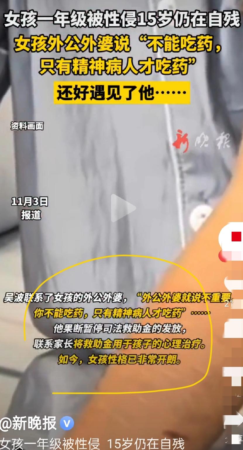 女孩一年级被性侵15岁仍自残,女孩外公外婆说“不能吃药,吃只有精神病人才吃药” 还好吴波的及时叫停,才没让悲剧继续!本是司法援助的救助金,他却果断暂停发放,硬要家属用这笔钱给女孩做心理治疗——这哪是简单的援助,分明是给绝望的孩子递了一把救命钥匙。 很多人总觉得“心理问题不算病”,甚至把心理治疗和“精神病”画等号,这种偏见比创伤本身更伤人。女孩的遭遇让人揪心,但家人的无知和忽视,差点把她推向深渊。 真正的帮助从不是给钱了事,而是看到受害者的核心需求:心理创伤和身体伤痛一样,需要专业治疗,需要被正视、被接纳。吴波的做法恰恰证明,找对方向的关爱,能让深陷黑暗的孩子重新向阳而生。未成年女生性侵