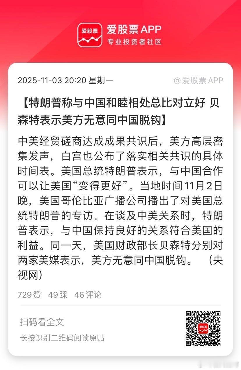 【特朗普称与中国和睦相处总比对立好 贝森特表示美方无意同中国脱钩】中美经贸磋商达成成果共识后,美方高层密集发声,白宫也公布了落实相关共识的具体时间表。美国总统特朗普表示,与中国合作可以让美国“变得更好”。当地时间11月2日晚,美国哥伦比亚广播公司播出了对美国总统特朗普的专访。在谈及中美关系时,特朗普表示,与中国保持良好的关系符合美国的利益。同一天,美国财政部长贝森... 天天都是心口不一的