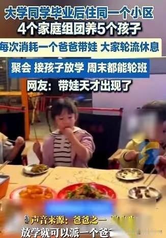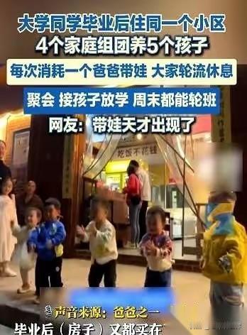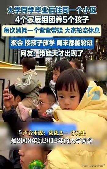 昔日同寝四年兄弟情深,如今合作带娃其乐融融! 湖南长沙。大学里一个寝室的哥们四个,毕业以后在同一个小区买了房子。相继结婚生子以后,他们搞起了“带娃合作社”! 一个家庭的爹或妈轮流值班,负责接走四家的娃们。另外的三对夫妻,喝茶、逛街、看电影……直接解放! 到了节假日,四家人经常一起出行,浩浩荡荡的!更妙的是,他们有规则有群聊,当值的父母会记录孩子们吃了什么喝了什么作业有没有完成! 这种带娃新模式并非一时兴起的“邻里互助”,而是蓄谋已久的“人生合伙”。读书时最铁的哥们儿,毕业后没有海角天涯,而是同小区做邻居再续前缘! 那种绝对的信任支持,毫无保留的接纳和理解,超越时空的友情,这些才是最难得可贵的!同宿舍的人 同宿舍的哥们 两代人同住 两代人同住 九年室友相处 亲子共事 带娃团队 多代同住
