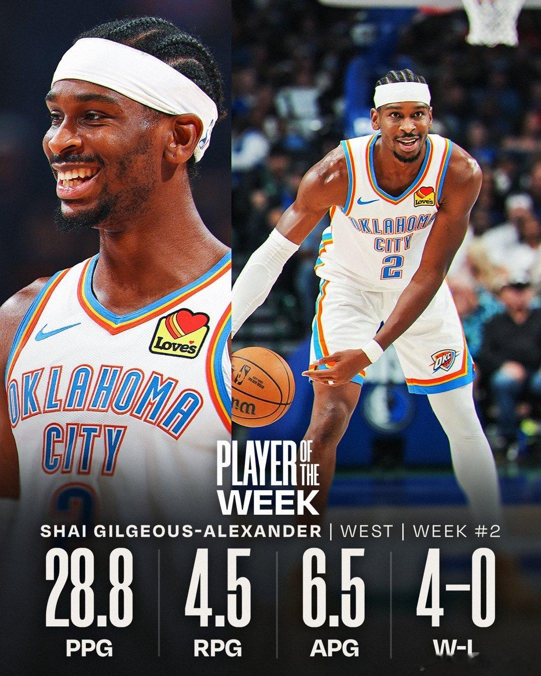 亚历山大上周场均28.8分4.5板6.5助,雷霆取得4胜0负新赛季篮不住