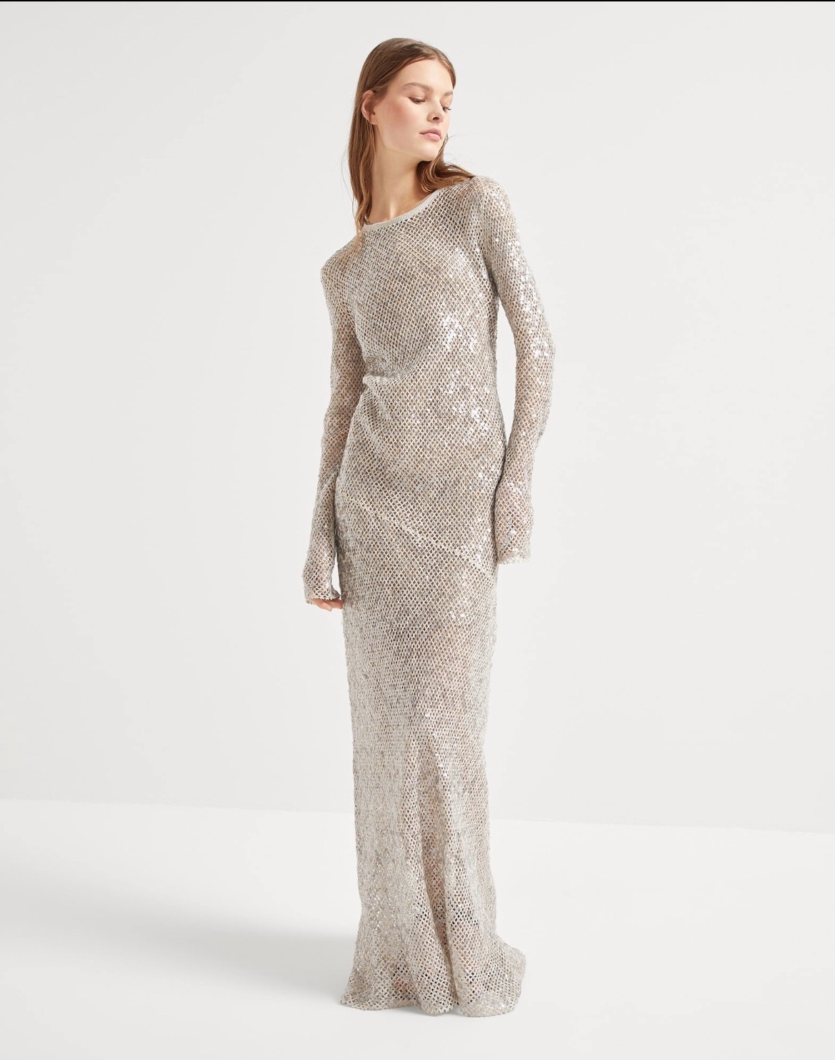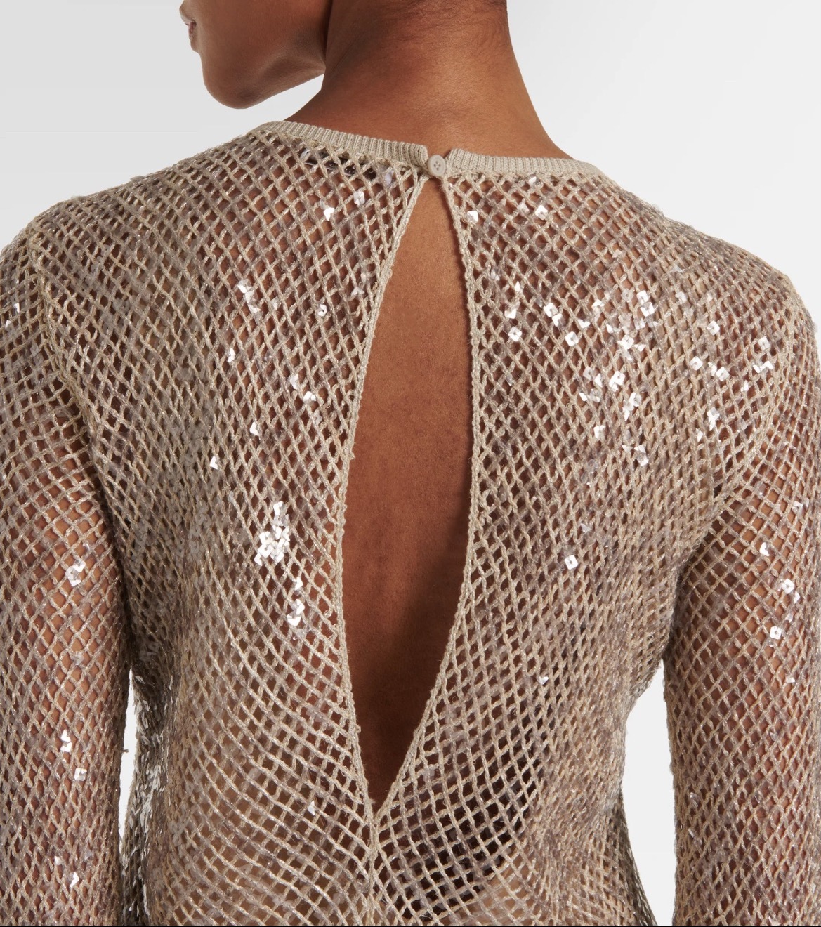 保利尼身穿Brunello Cucinelli SS25 亚麻、丝绸、醋酸纤维和聚酯的亮片网状超长连衣裙(8500欧元)亮相总决赛大合影,相比其他几位球员,保总属于身材小巧型,个人感觉这个裙子戒掉下半部分裙摆,到膝盖下,露出小腿,更适合一些,让保总看起来身材修长。