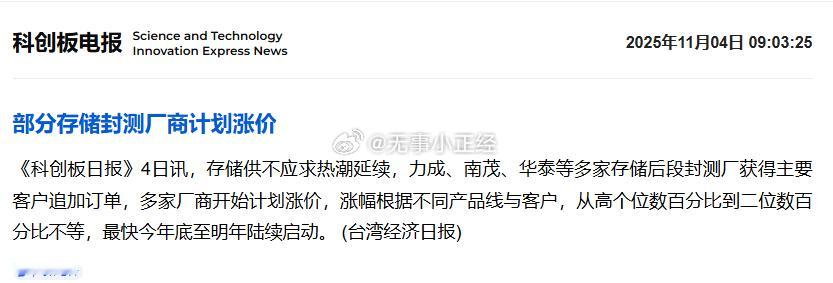 部分存储封测厂商计划涨价。
