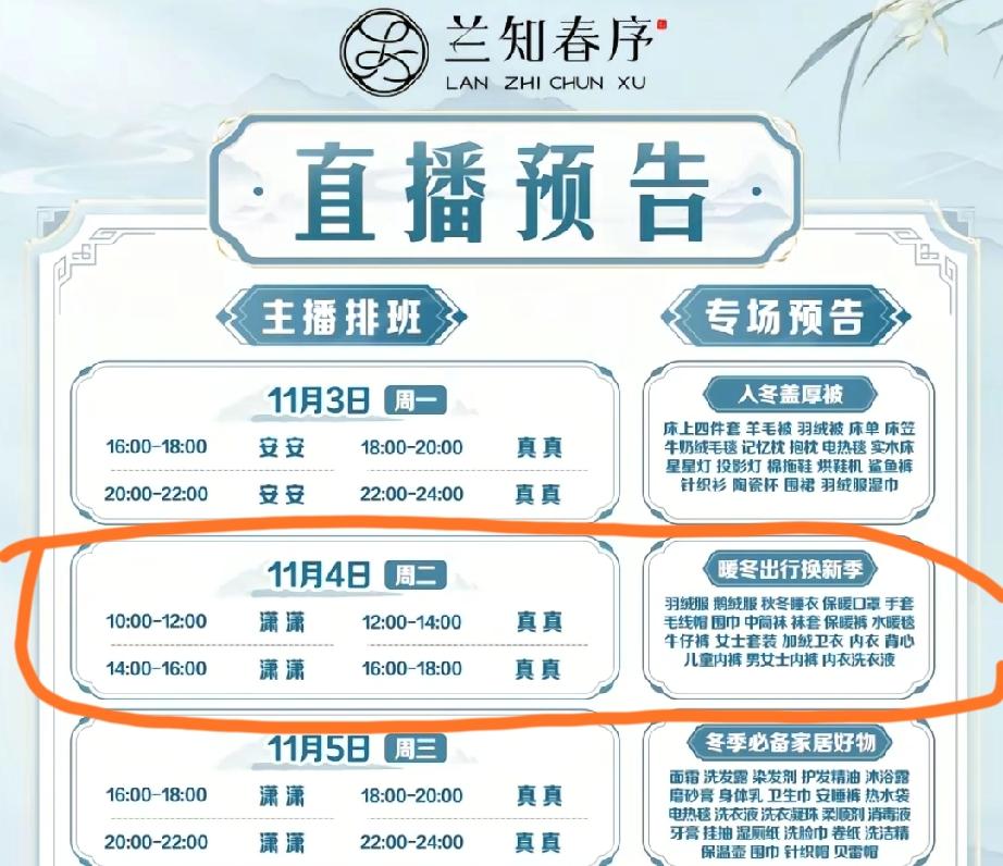 你们发现了吗?今天,兰知春序从上午10点钟播到下午六点, 潇潇和真真两人换班,播的内容是暖冬出行换新季。商品有羽绒服、鹅绒服、秋冬睡衣、保暖口罩、手套、毛线帽、围巾、女装、内衣…… 不知道为什么兰知春序突然改变直播时间呢,难道今天是要播外场吗?也有可能,不过等一下,到10点钟就能揭晓答案了。 正好天冷了,准备给女儿买个围巾、手套,马上抽空去直播间转转去,你们有什么需要的也都可以来哟! 董宇辉 与辉同行 兰知春序 潇潇