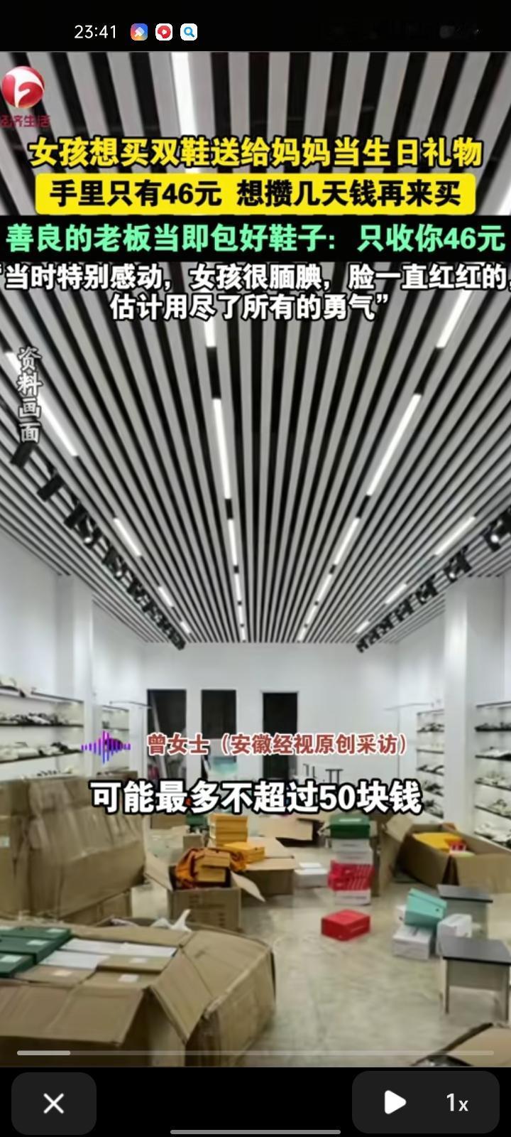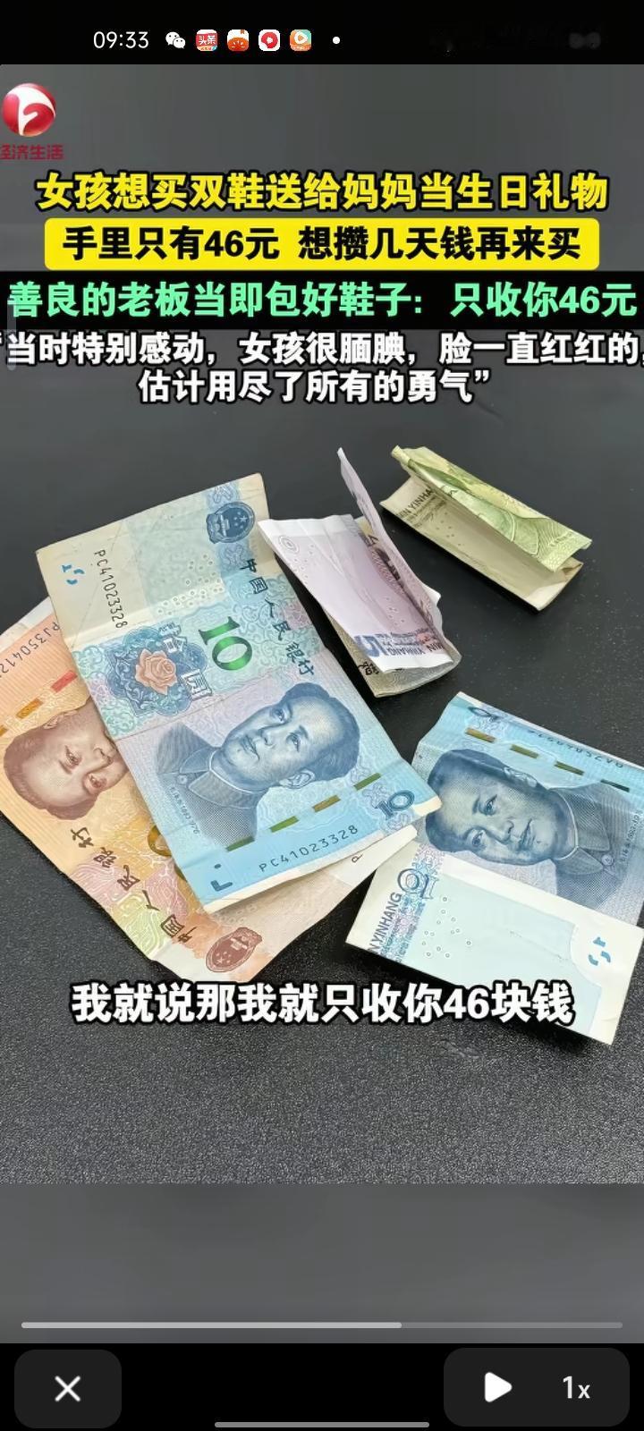 11月1日,十堰市房县。10后小孩姐进店里问老板有没有买得起的,最多不超过50元,说要送给妈妈当生日礼物,可她手里只有46元,想着几天攒几天钱再买。老板看这特别感动,决定只收46元。 孩子妈妈在评论区称,自己准备睡觉时女儿悄悄买了礼物,拿出来的时候自己一脸震惊,怀疑不是女儿自己买的。老板表示,看得出她是一个腼腆的小女孩,脸一直红红的,估计用尽了所有勇气。