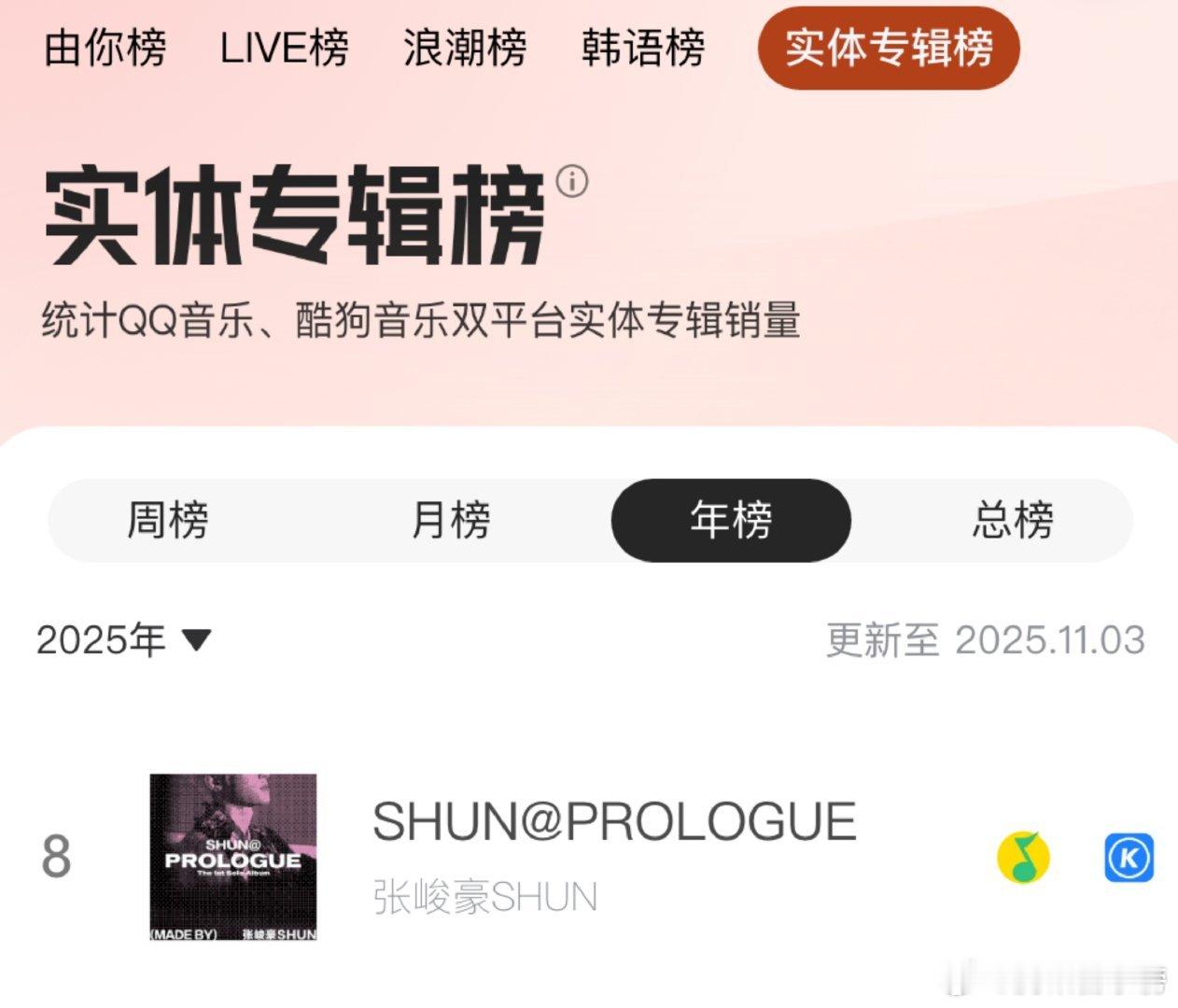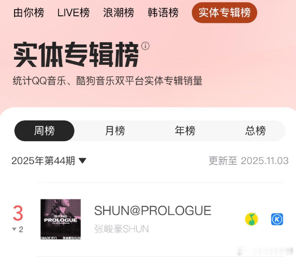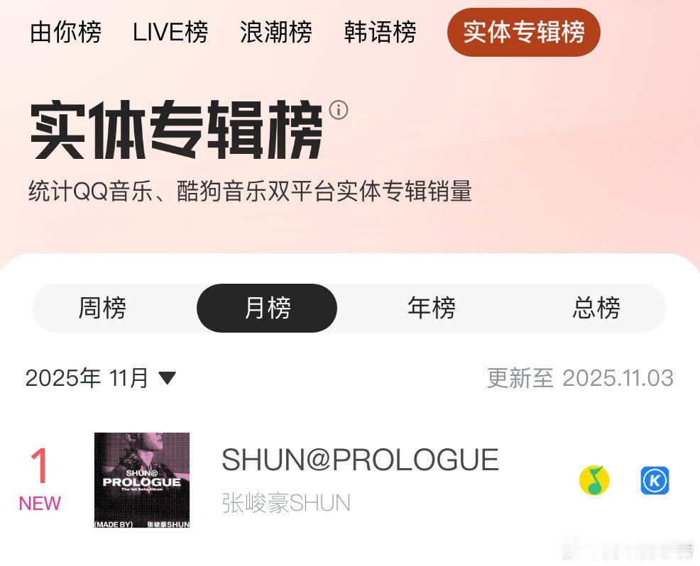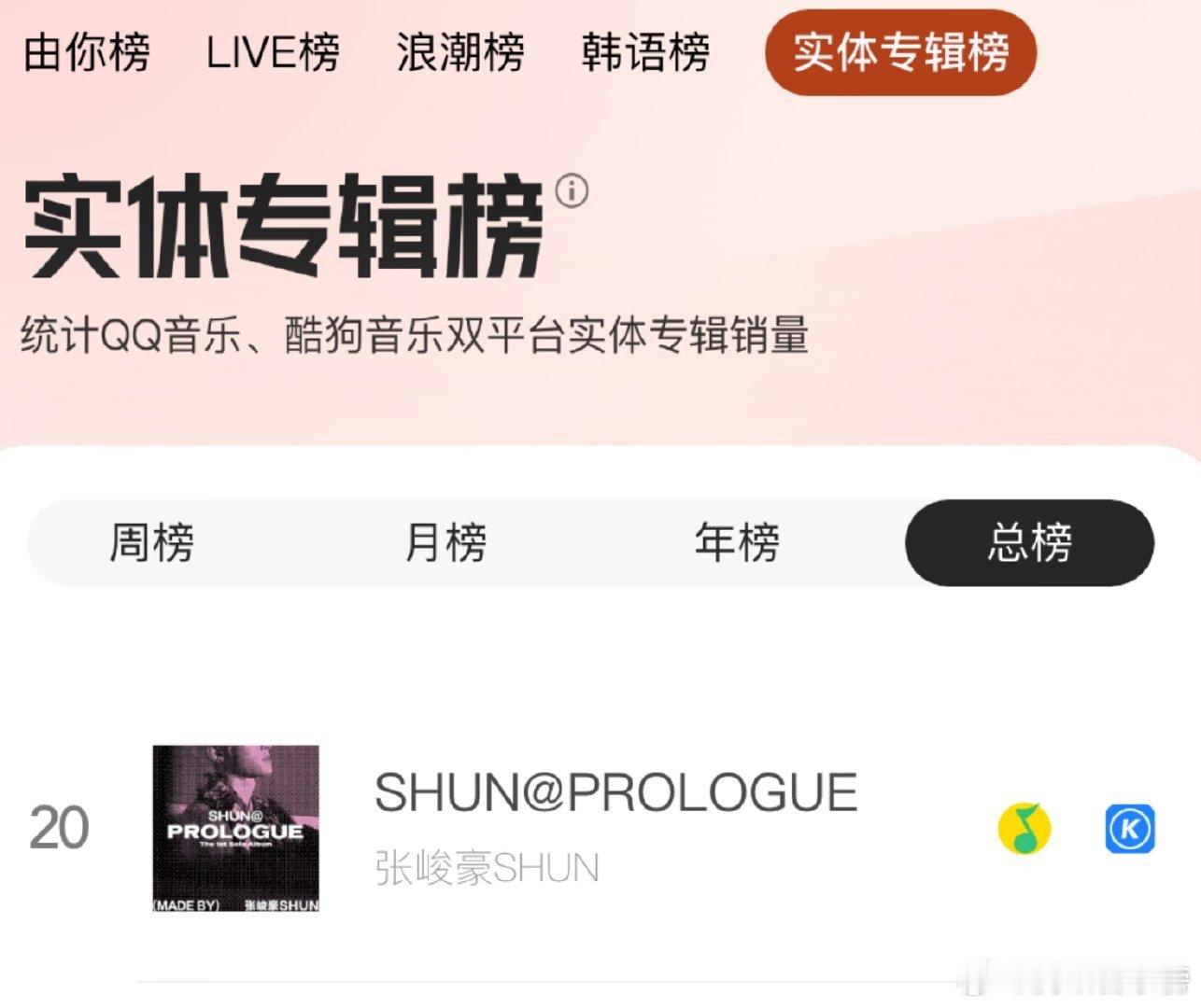 张峻豪《SHUN@ PROLOGUE》首张个人实体专辑进入腾讯音乐实体专辑榜!目前位列周榜TOP3、月榜TOP1、年榜TOP8、总榜TOP20!