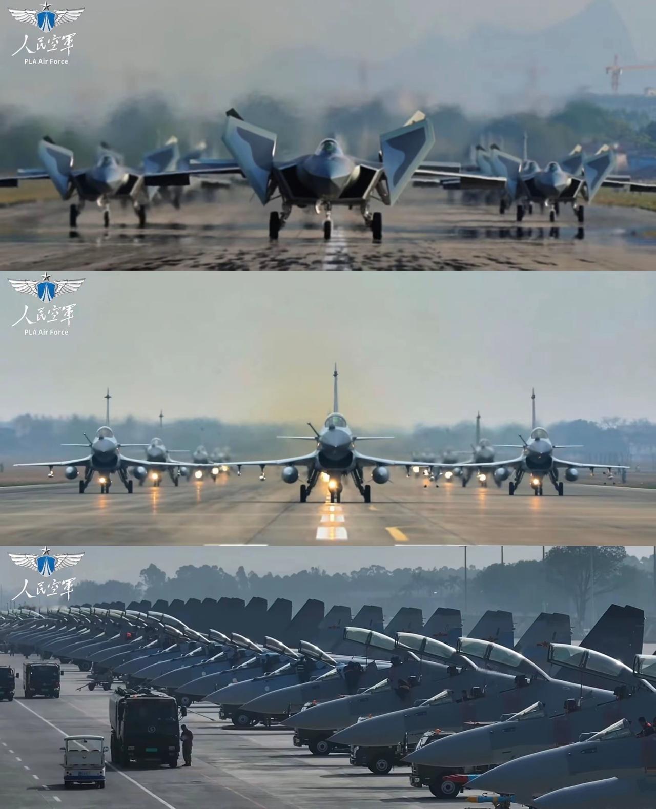 军宣这两年换风格了,很多人怕是还没适应过来! 之前,动不动将战机拍的小小一只; 现在,不仅直接原貌展示,而且还加大了数量。 有道是,打退不如吓退,不战而屈人之兵才是王道。
