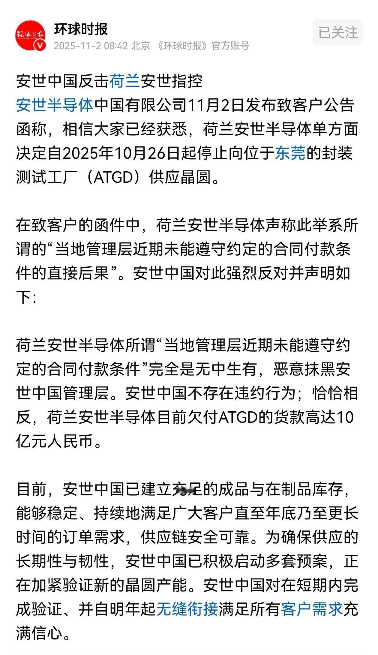 路透社昨天(11月3日)报道称,全球汽车零部件巨头德国采埃孚正与中国有关部门申请对安世半导体芯片出口豁免,以确保芯片供应。至此,安世中国公司成功实现供应链重置。此前闻泰科技全资子公司荷兰安世半导体负责生产芯片、签定供销合同,安世中国公司负责封装加工,按指定地区出口。荷兰政府强行接管安世半导体破坏了全球供应链,10月26日荷兰安世发公告停止对安世中国公司供应芯片,真是想啥来啥,双方再无瓜葛,供应链完全由安世中国实现了重置。现在欧洲汽车零部件巨头服软了,美日两国还在观望,但是不想让本国汽车制造商停产,也必须向中方申请豁免,签定供应合同并使用人民币结算。国际金融专家评论指出:再见,欧洲。你又输了!(图3)