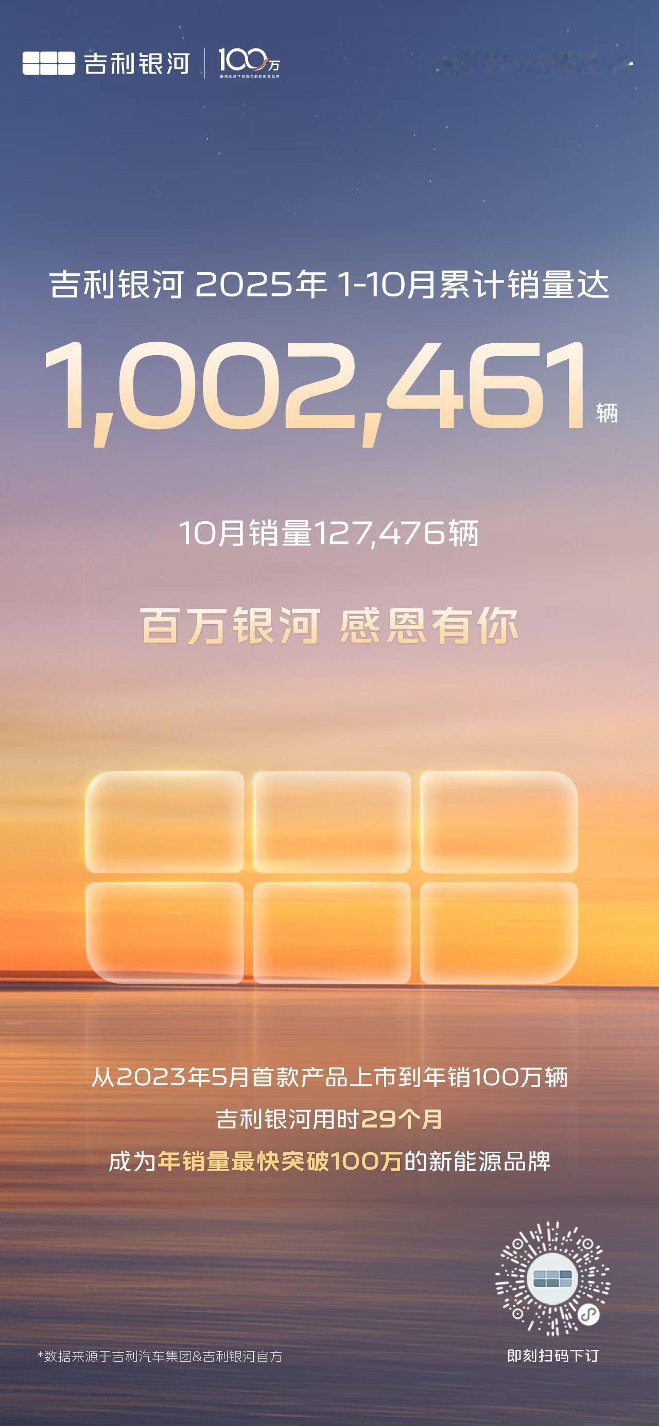 都知道销量是产品与品牌最强有力的背书,而吉利银河10月销量直接突破百万,这个销量目前全国只有两家新能源品牌达成,放眼全球也只有三家新能源品牌拥有这个成绩。而仅用29个月实现这个成绩的吉利银河则是用时最短的选手,百万销量“速度第一,中国唯二,全球前三”,这里的含金量与难度可想而知。