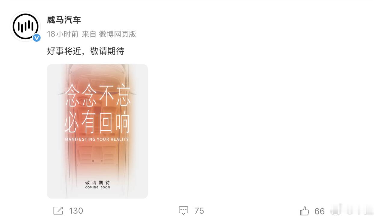11月3日,威马汽车发微博称“好事将近,敬请期待”,配图“念念不忘,必有回响”。据悉月底将召开新车发布会,公布下一步动向。