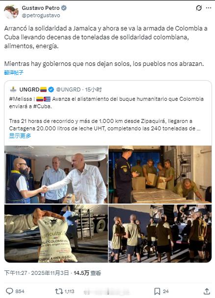 哥伦比亚海军向古巴运送数十吨紧急援助物资。