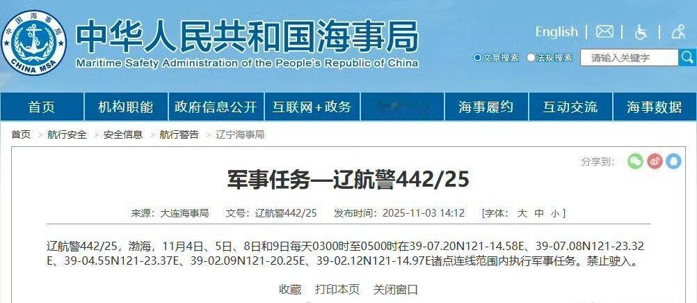 航行警告【渤海执行军事任务】据中国海事局网站消息,大连海事局发布航行警告,11月4日、5日、8日和9日每天3时至5时,渤海部分海域执行军事任务,禁止驶入。