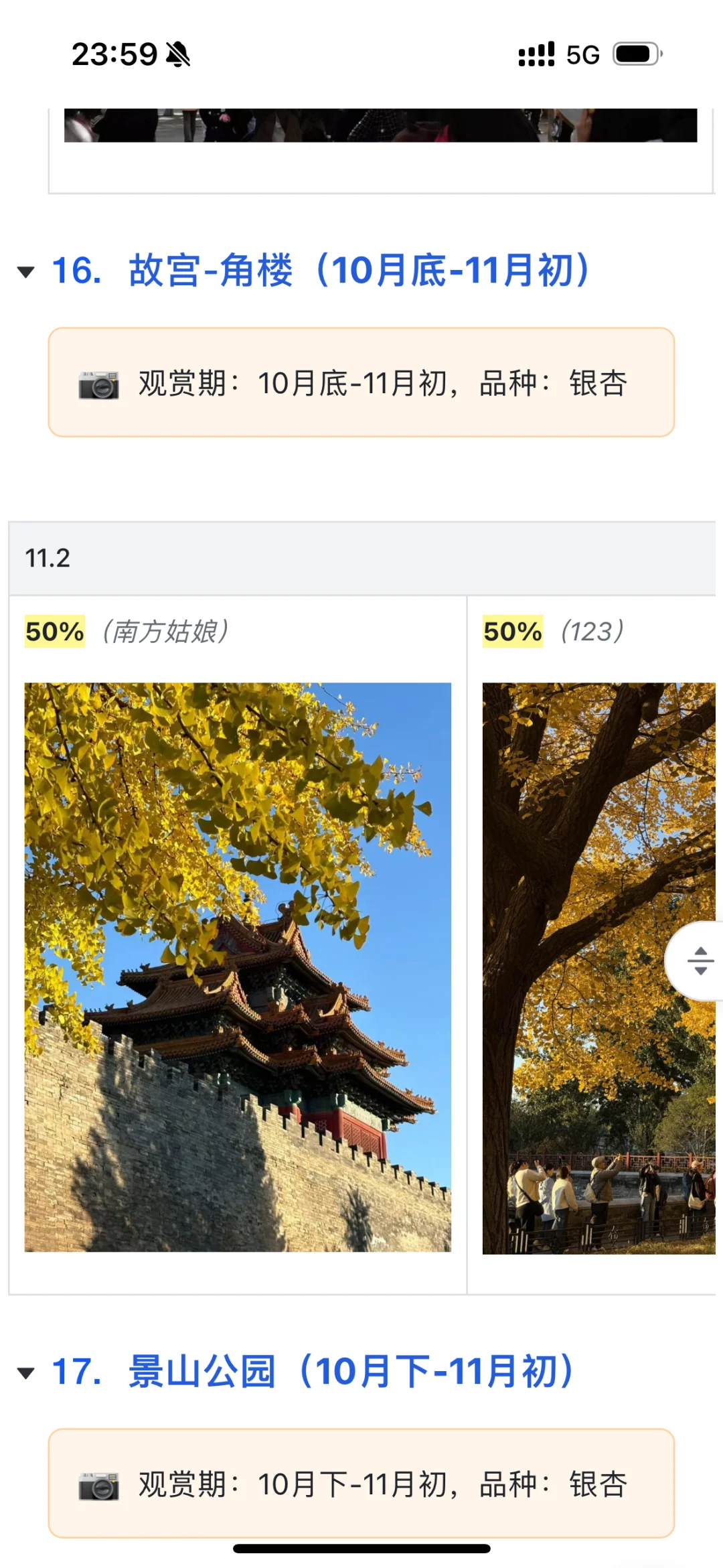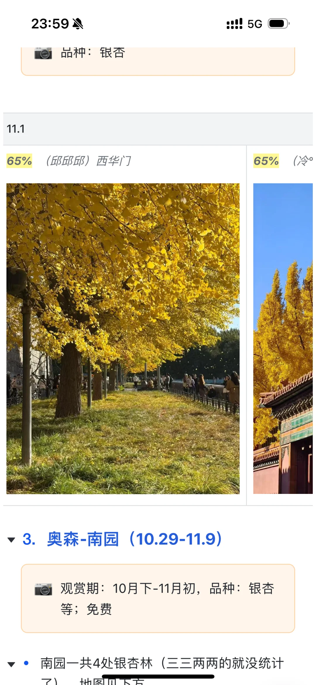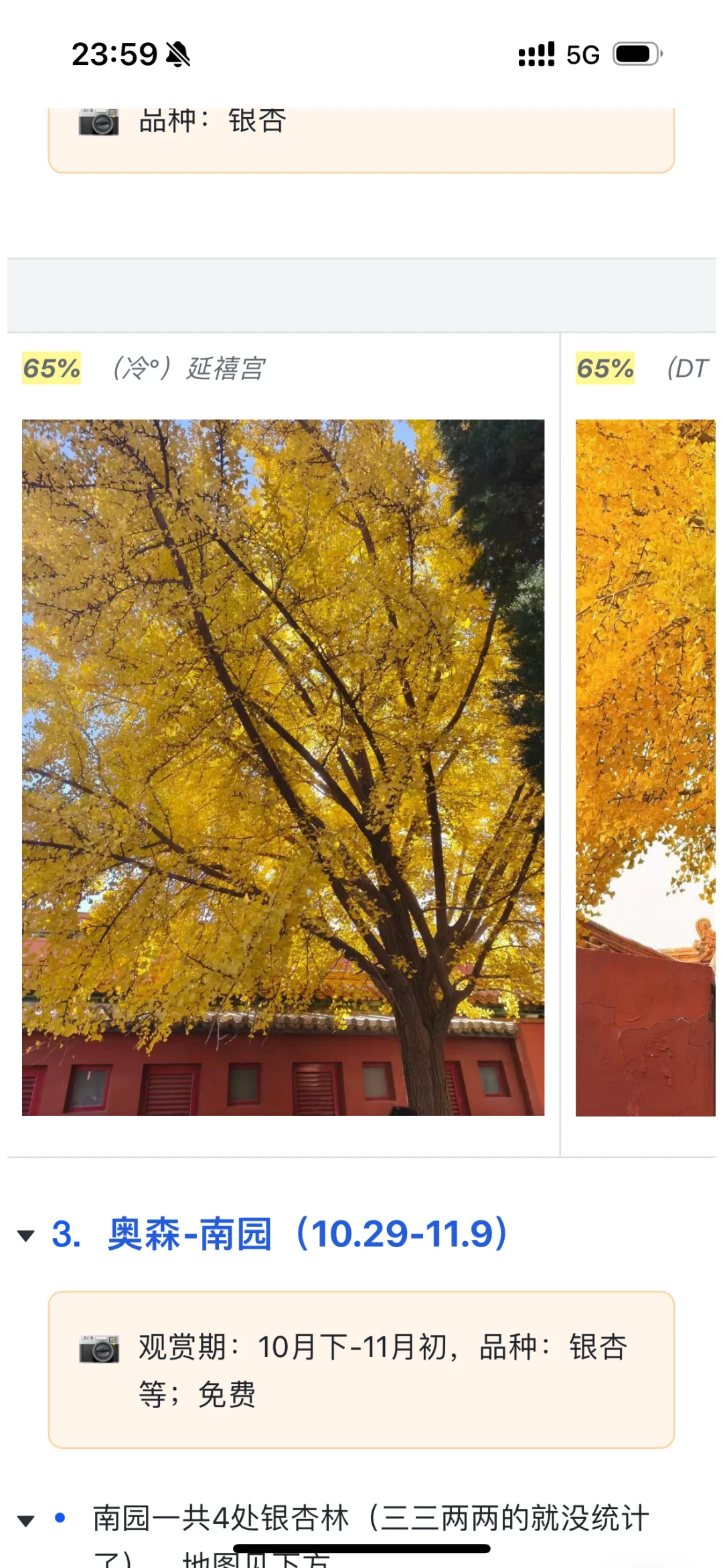 故宫西华门,延禧宫等地方的银杏黄了 角楼也差不多进度45% 最近有几个地方银杏开始掉了 害怕周五下雨之后,银杏会被等吹掉 这会在学去故宫的门票,才发现居然这周四到周日都还有很多票! 故宫的票这么好约了吗? 如果银杏黄了70%,即便天气没那么好,也是好看的。 加上下雨,人应该更少吧。 就更适合我这种错峰的人了 所以我这周五冲! 去完后,我顺便把故宫的游玩路线图也出下,故宫不只是赏秋!