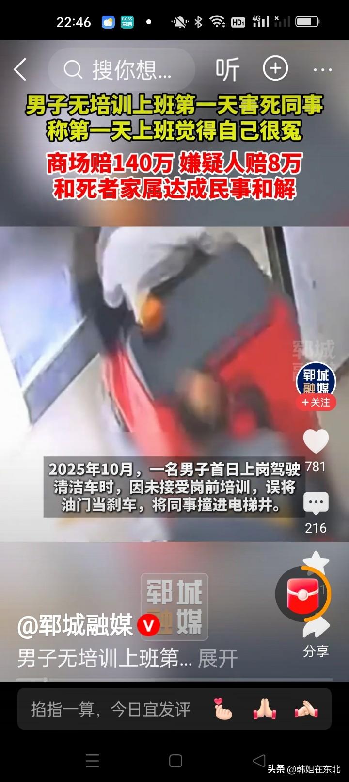 男子上班第一天害死同事!这男子简直让人无语。北京一商场新入职保洁员张某,上班第一天就出大事。他没经过岗前培训,也没特种车辆驾驶资质,开清洁车时把油门当刹车,把同事撞进电梯井致其当场死亡。更离谱的是,他没在原地等民警,还在主管要求下继续清扫。他居然自称“冤枉”,法院回怼“死者比你更冤”太解气。 最终商场赔140万,他个人赔8万,还因刑事犯罪被公诉。要是他撞人后第一时间救援,结果或许不同。只能说,没能力没担当,还喊冤,真让人看不下去。