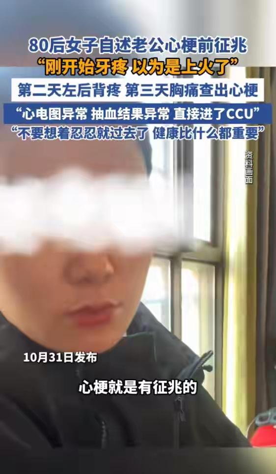 80后妻子血泪提醒:老公心梗前3天的信号,我们差点都当“小毛病”忍了 “第一天说牙疼,他还笑着说‘最近熬夜改方案,上火了’;第二天左后背疼,贴了片膏药就去上班;直到第三天胸痛得直不起身,我们才慌了——到医院直接被推进CCU,医生说再晚来半小时,人可能就没了。” 安徽这位80后妻子的自述,刷到的人几乎都心头一紧——因为这太像我们身边人的日常了。谁没经历过“牙疼忍忍就好”“后背疼是久坐累的”?尤其是家里的顶梁柱,总觉得“扛一扛”就是本事,却不知道心梗的信号,早就藏在这些“不起眼的不舒服”里。 妻子说,老公平时身体看着壮实,加班到凌晨是常事,偶尔喊累也只当是工作忙。牙疼那天,还自己去药店买了降火的药;后背疼时,甚至开玩笑说“是不是昨天搬快递岔了气”。直到胸痛发作,他还想先把手上的项目收尾,是妻子硬拽着去的医院。 “医生说,心梗不是突然来的,牙疼、后背疼这些‘不典型症状’,其实是身体在求救。”这句话戳中了多少人?我们总觉得“大病会有大反应”,却忘了很多致命的信号,都裹着“小毛病”的外衣。尤其是现在人压力大,熬夜、外卖、久坐成了常态,身体的预警很容易被“忍忍就过”的侥幸心理盖过去。 妻子现在逢人就说:“别觉得自己年轻就折腾,也别把家人的‘小不舒服’当小事。健康这东西,没了就是没了,再后悔都来不及。” 你身边有没有人也忽视过身体的小信号?或者你自己有过“忍到受不了才去医院”的经历?评论区说说,也给身边人提个醒!心梗症状 老人心梗 心梗风险 心梗支架活多久 心梗自救方法