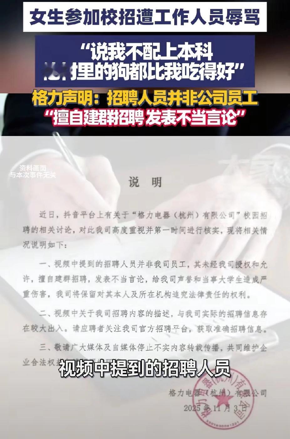 格力电器的声明,到底是甩锅还是撇清关系呢?事件的起因是近日有一名女大学生参加格力电器杭州校招,在招聘群里遭到工作人员的辱骂。 她只是咨询一些招聘的相关问题,结果对方就极尽侮辱,说出“你这还上本科?我们村的狗吃的都比你好。”还对女生的头像进行恶意调侃。称“你的头像是特效吗?哪有真人长这样的?” 女生不堪侮辱,在社交媒体平台发视频吐槽,引起网友的热议。 11月3日,格力电器杭州有限公司发布声明称,涉事招聘人员并非公司员工,是他擅自建群招聘,而且发表不当言论,公司将追究其法律责任。 然而这种声明却引起网友的质疑。有人说:“一出事就说不是在职员工。”到底是甩锅还是撇清关系呢?谁有这么大的胆子,竟然冒充格力员工呢? 然而有的网友却表示,的确有这个可能。杭州有很多劳务派遣公司,所以很有可能这个工作人员就是中介,代替格 力去学校招聘的。因为大学生自己找工作,工厂不会要。 可格力的态度却表明,非公司的HR擅自建群招聘已经构成诈骗、刑事犯罪了,还对公司的声誉造成影响,有可能会追究法律责任。 如果真的是这样的话,那就大快人心。像这种人,不管他是不是中介,还是其他工作人员都应该狠狠的惩罚。因为如果是心理比较脆弱的大学生,很有可能会对他们的心理造成阴影,你们说呢?格力 素材来源:大象新闻