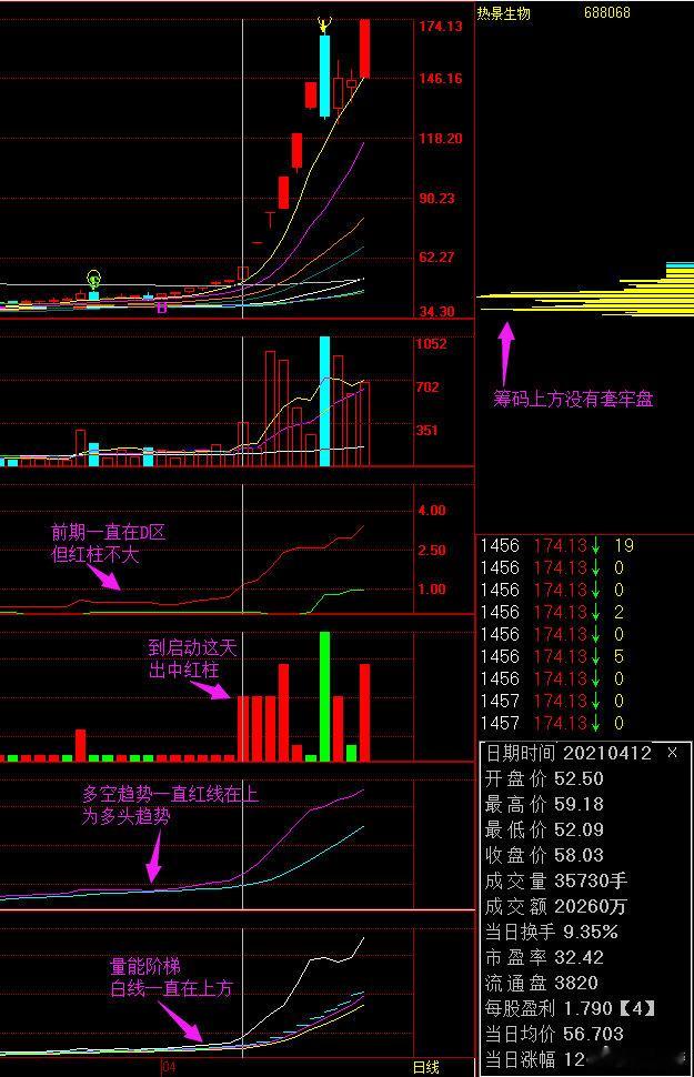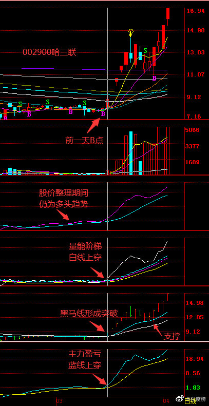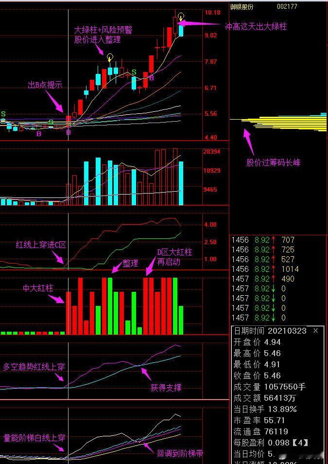 量能阶梯(KVRF)指标:是笔者研制的针对中线操作的参考指标,其中白线上穿阶梯是中线转好信号,阶梯持续上行,说明行情拾级而上,阶梯出现向上跳行,说明进入加速状态,黄线与紫线是支撑位与压力位,但白线与黄、紫线乖离较大,则股价会向阶梯带回落,到阶梯带上方止跌属于强势调整,回调进入阶梯带但不破黄线,属于正常调整,这两种调整,调整结束后重新上行创新高概率大。若调整破黄线,则说明这一轮行情已经结束,接下来调整结束重新上行创新高机率较少,故当反弹看,反弹结束要及时离场。白线在阶梯线下方运行,阶梯线逐级而下的股,不适合中线参与。