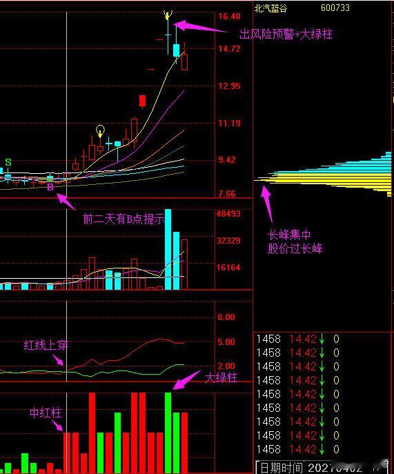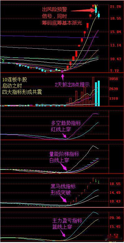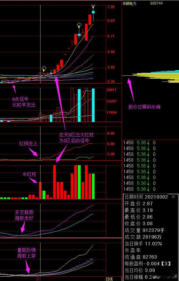 筹码:是笔者的特色的指标,与其他常用筹码区别较大,使用时多参考筹码长峰,长峰密集的股启动的概率大,股价过筹码长峰再结合C区出击、D区启动信号,往往能捕捉到短线热门个股。同时底筹长峰是观察主力是否出货的较好指标,若长峰消失则说明主力已经完成派发,要当心股价冲高回落(高位有新主力重新接力除外)。