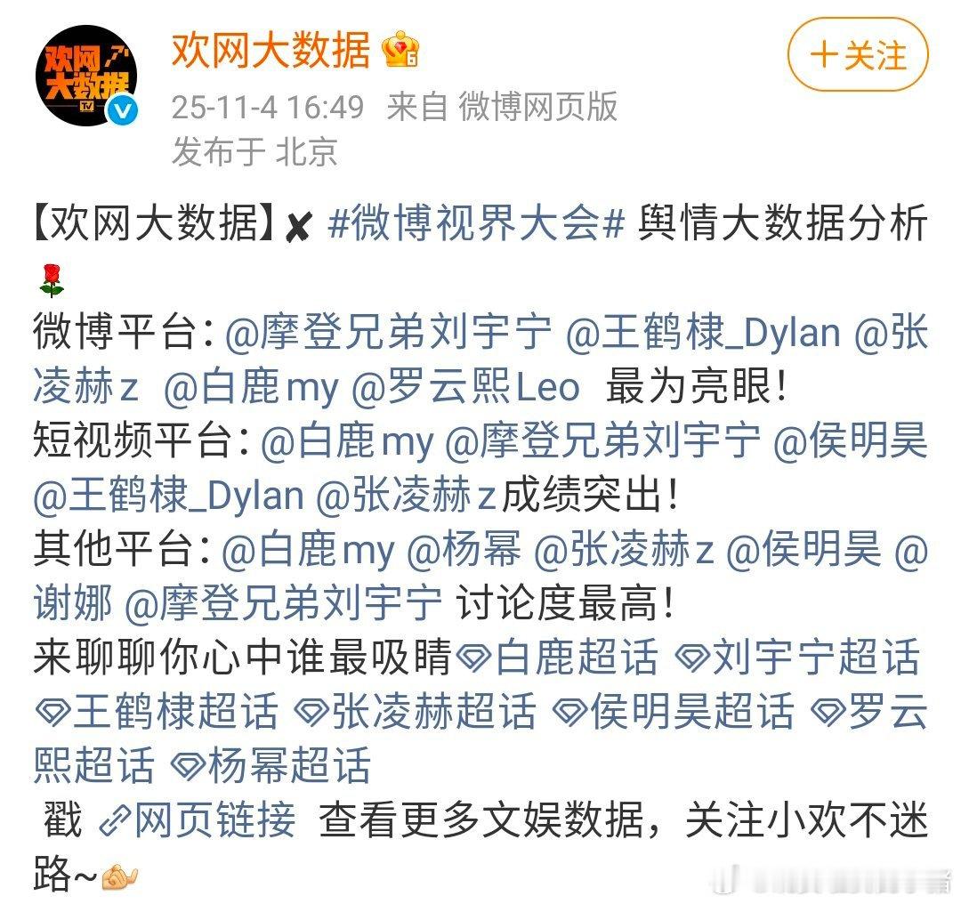 昨天微博视界大会的百指📚🍊来了女艺人破万的只有白鹿男艺人破万的分别是:刘宇