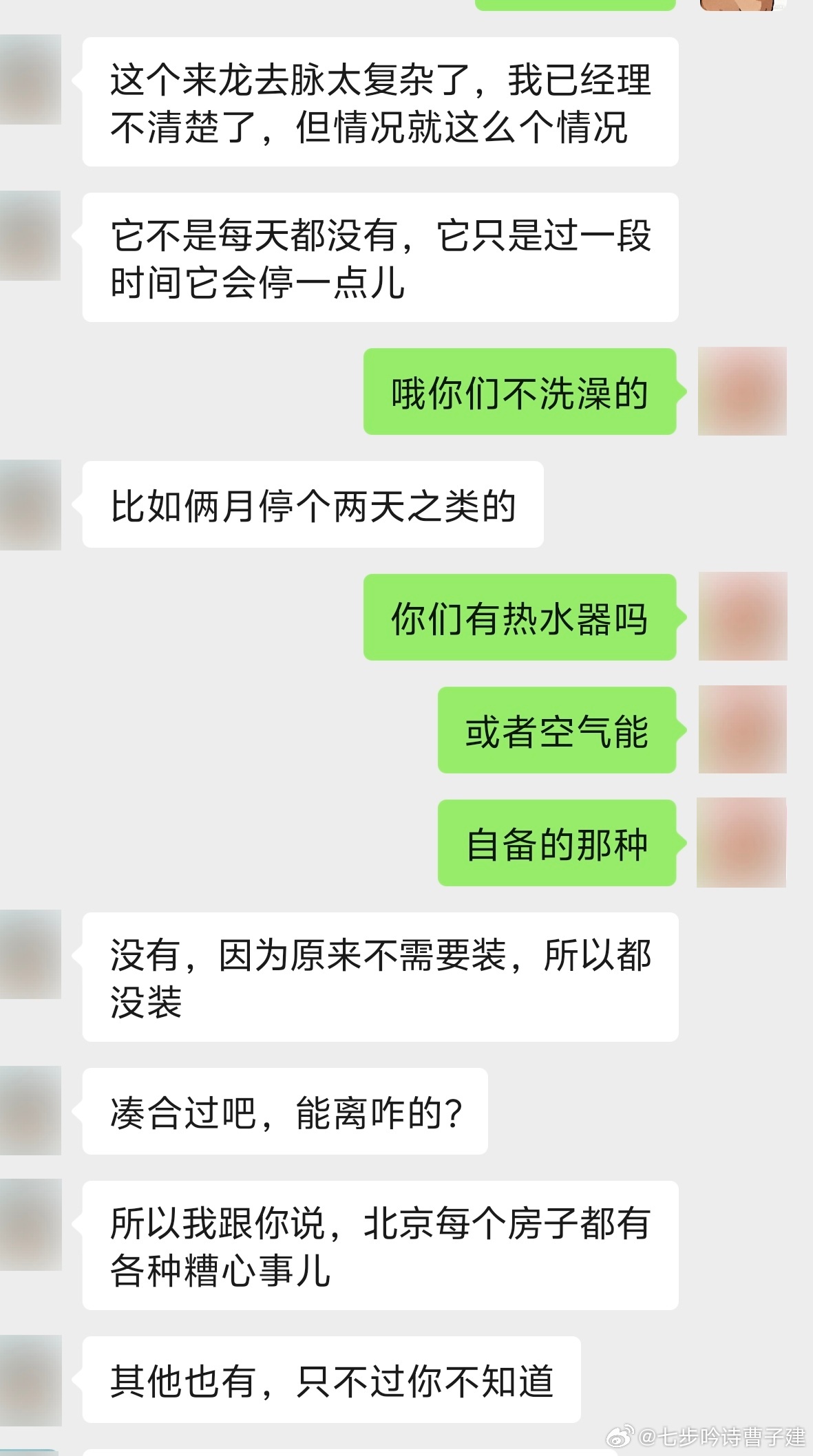 北京基友(男的)说他家停热水了,俺不中嘞,北京冬天偶尔停两天热水不能洗澡我可不行,回京后问问我爹能不能自备热水器[淡淡的][淡淡的][淡淡的][淡淡的]