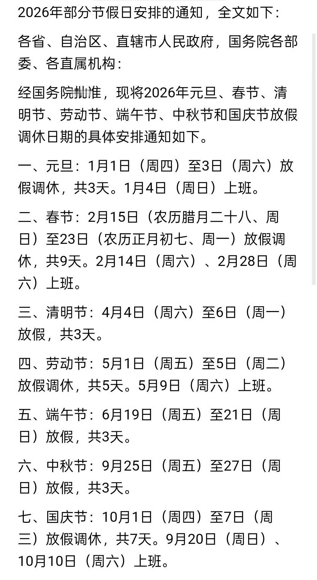 2026春节放9天假已经算合理的安排了,最起码除夕前一天就会放假,比起前几年除夕当天放假好不少,回家还能赶上帮帮忙。非要算上一堆周末减日子,那过年还能不回家?