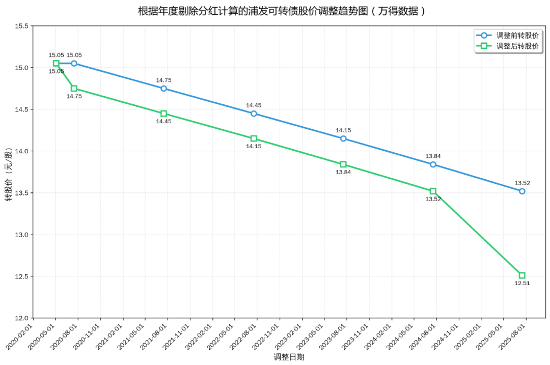 2019年11月,浦发银行发行500亿元浦发转债,初始转股价格为15.05元/股,后因年度利润分配调整至12.51元/股。