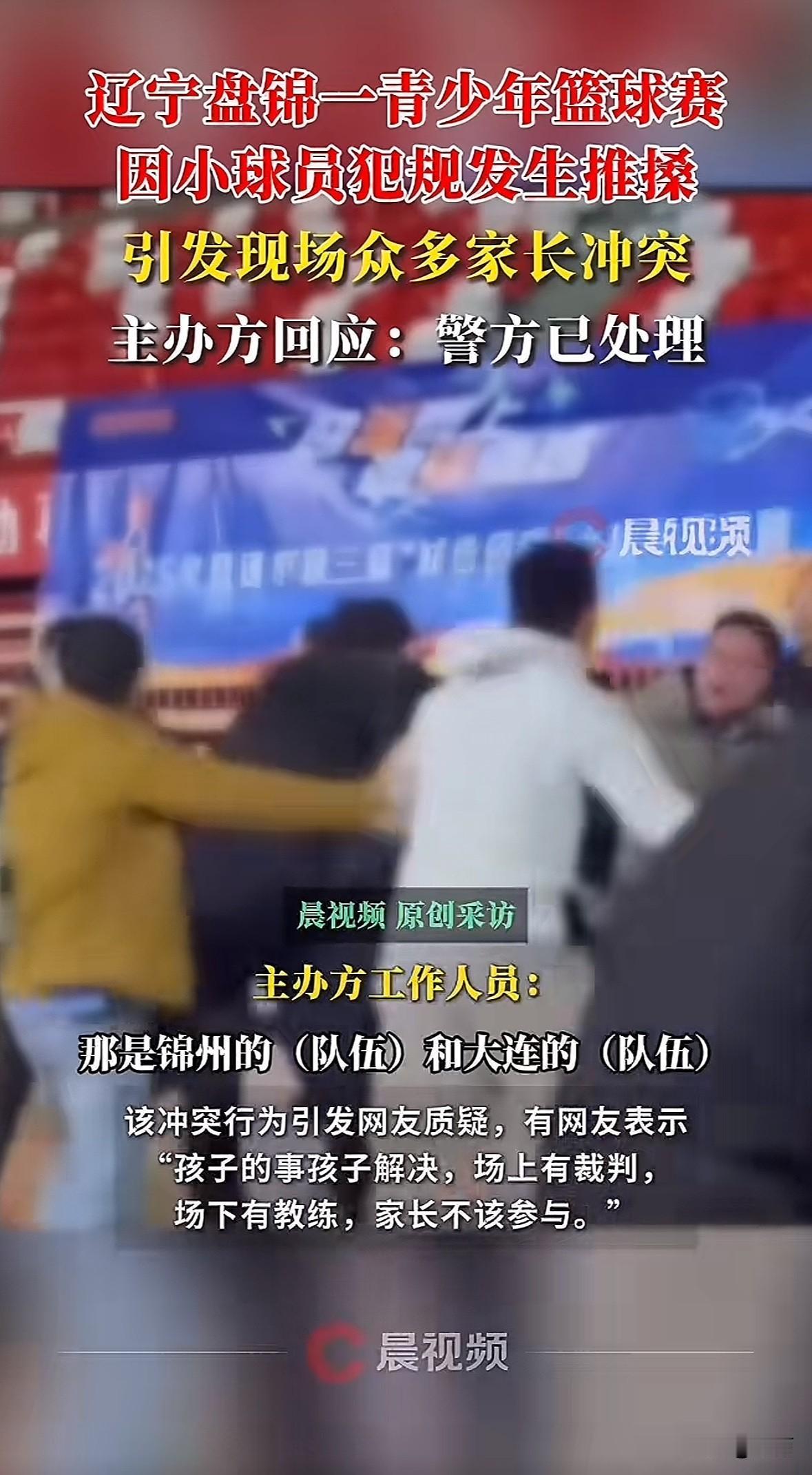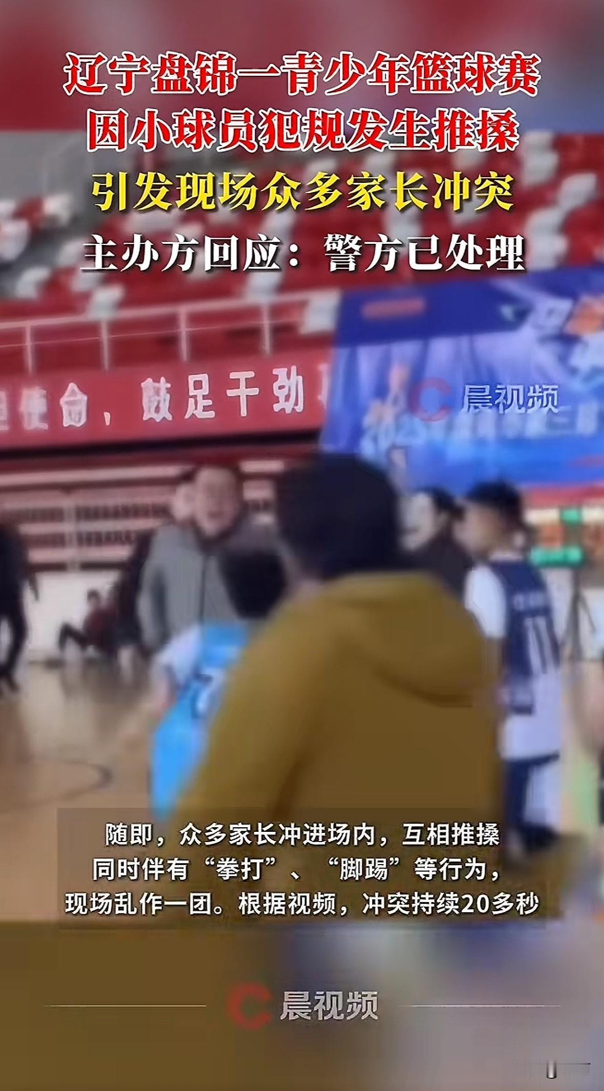 辽宁盘锦第三届“城市传奇”小篮球精英赛上,锦州和大连的小球员赛场发生推搡。裁判已制止,一名家长却冲进场推倒对方孩子,引发多名家长拳打脚踢,混乱持续20多秒。涉事家长是惯犯,闯祸后跑路,被警方人脸识别找回,赔偿2.5万元私了。主办方说警方已处理完毕。 青少年球赛本是培养体育精神,孩子间摩擦很正常。家长冲动动手,不仅给孩子做了坏榜样,还违背赛事初衷。孩子的事该让他们自己学着处理,有裁判和教练协调,家长没必要越界。这种行为该被抵制,不然只会破坏赛场氛围,也教坏孩子遇事用暴力解决。