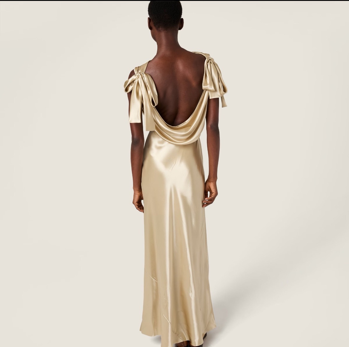 高芙当然穿Miu Miu 亮相总决赛大合影。这件醋酸粘粘的长缎连衣裙,背面有垂坠和蝴蝶结细节,美国名将穿的是定制靛蓝(4700美元),官方对外销售是金色款。此外,Miu Miu金属皮革细高跟鞋带扣(1250美元)。