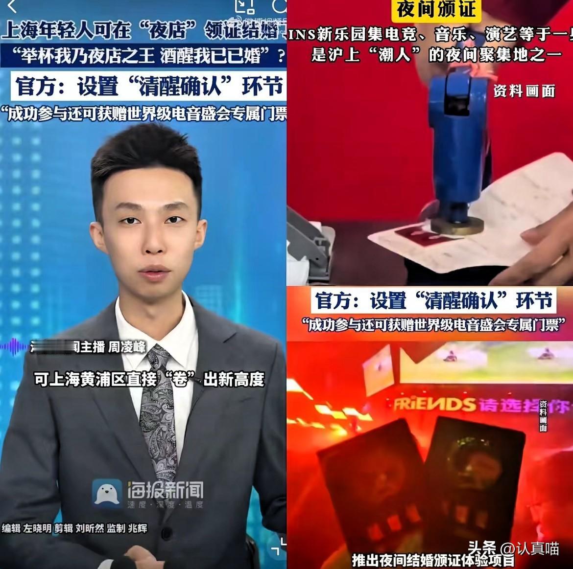 结婚取消户口本,我忍了; 离婚有冷静期,我也忍了,但说夜店能直接领证,这误会可太大了! 先澄清下,上海这操作不是让你在夜店拿证,而是领完证后能去INS新乐园办颁证仪式,法定手续还得去民政局办。所谓的“酒精测试”,其实是确认双方清醒的状态检查环节,压根不是喝完酒直接领证。 但吐槽也没毛病——年轻人不愿结婚,根源是住房、育儿这些现实压力,可不是领证仪式不够潮。