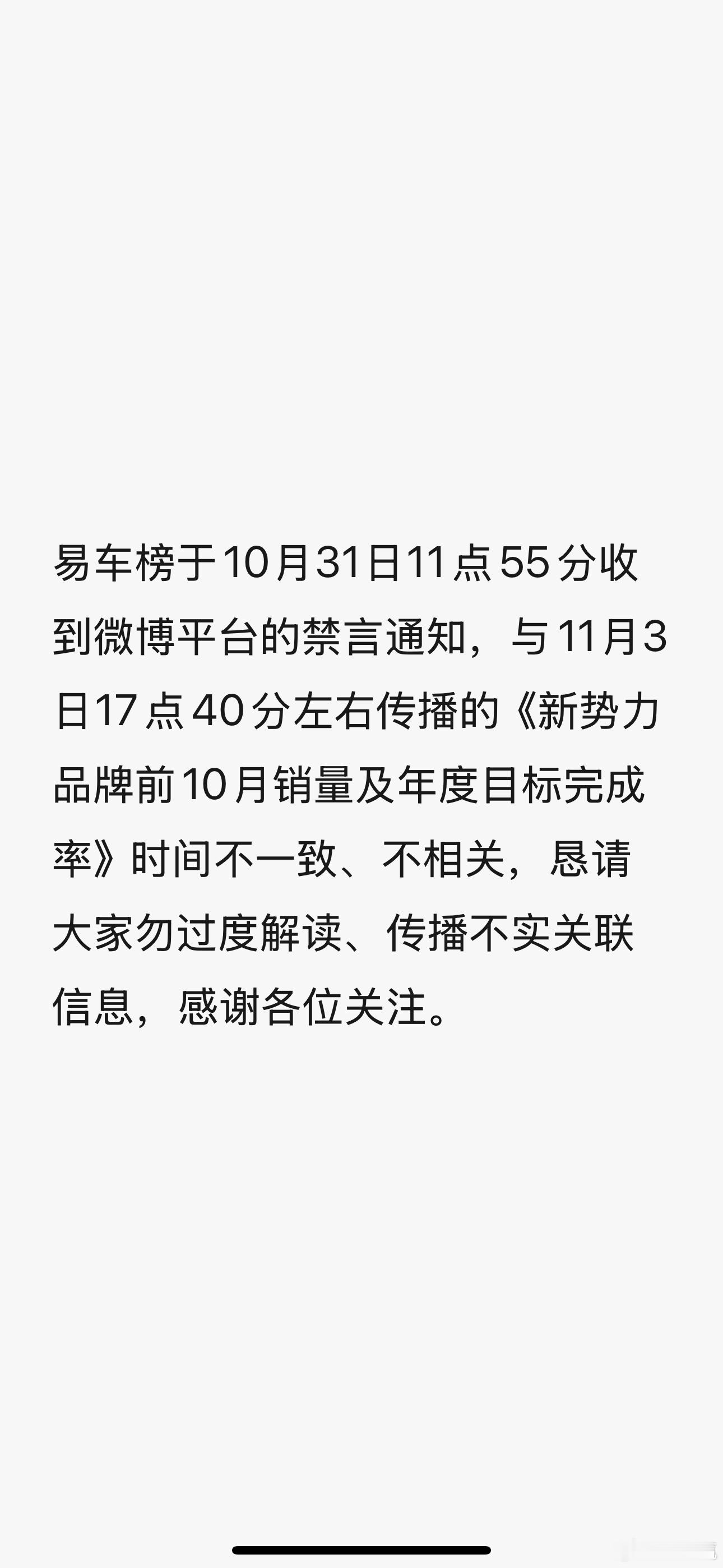 易车榜于10月31日11点55分收到微博平台的禁言通知,与11月3日17点40分左右传播的《新势力品牌前10月销量及年度目标完成率》时间不一致、不相关,恳请大家勿过度解读、传播不实关联信息,感谢各位关注。