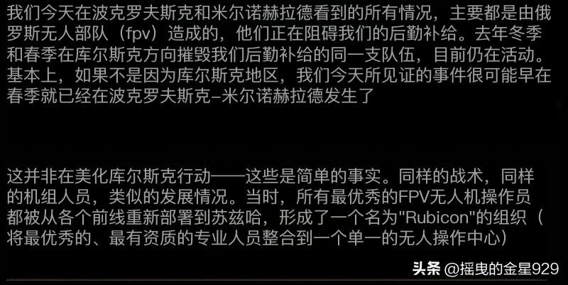 波克罗夫斯克,乌军体验感极差,总而言之,他们感觉,目前他们在波克罗夫斯克地区,就好像当初在库尔斯克苏贾一样。 乌军说,“我们今天在波克罗天斯克和米尔诺赫拉德看到的所有情况,主要都是由俄罗斯无人部队(fpv)造成的,他们正在阻碍我们的后勤补给。 去年冬季和春季在库尔斯克方向摧毁我们后勤补给的同一支队伍,目前仍在活动。 基本上,如果不是因为库尔斯克地区,我们今天所见证的事件很可能早在春季就已经在波克罗夫斯克-米尔诺赫拉德发生了。” 乌军表示,“这并非在美化库尔斯克行动,这些是简单的事实。同样的战术,同样的机组人员,类似的发展情况。当时,俄军将所有最优秀的FPV无人机操作员都从前线各个部署到苏贾,形成了一个名为"Rubicon”的无人机组织。” 值得注意的是,“卢比孔”无人机部队从每天都在对前线各地区的乌军目标实施打击,包括乌军车辆,装甲车,坦克,火炮,固定翼无人机,雷达,电子设备,以及乌军人员,每天打击目标的数量多达上百个。持续时间已有一年之久。 这里指的是每天,每天都如此。上百个乌军目标遭俄军“卢比孔”无人机部队打击,而他们使用的无人机,大多数为普通FPV无人机,而非光纤无人机。