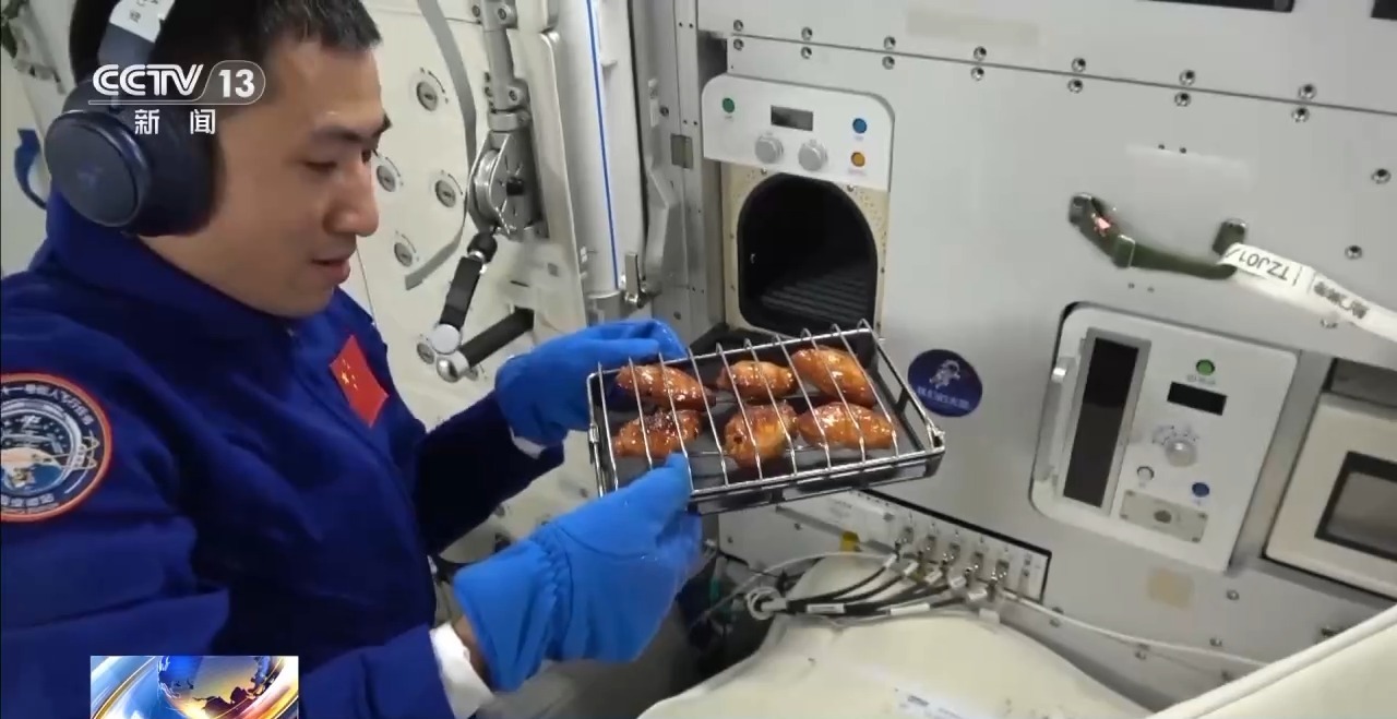 中国航天员科研训练中心 刘伟波:我们把温度提高到190℃,这样就真的是在轨烹饪,以往加热是物理反应,现在是真正在轨做饭是理化反应了,做出来的饭可以烤到焦黄、烤到焦脆,做的饭是喷喷香。