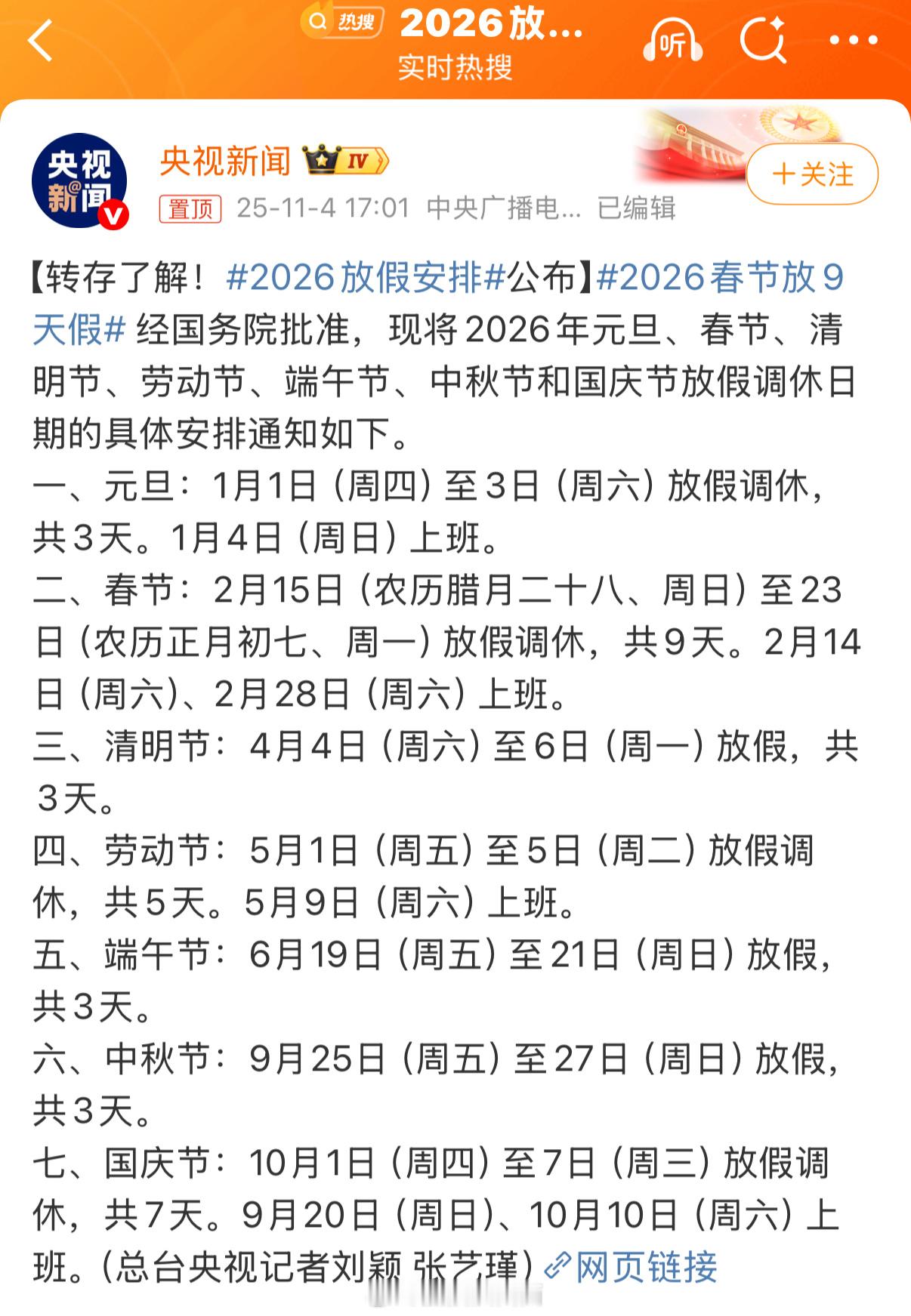 2026春节放9天假春节放九天假太爽了,但是能不能别调休了[泪奔]