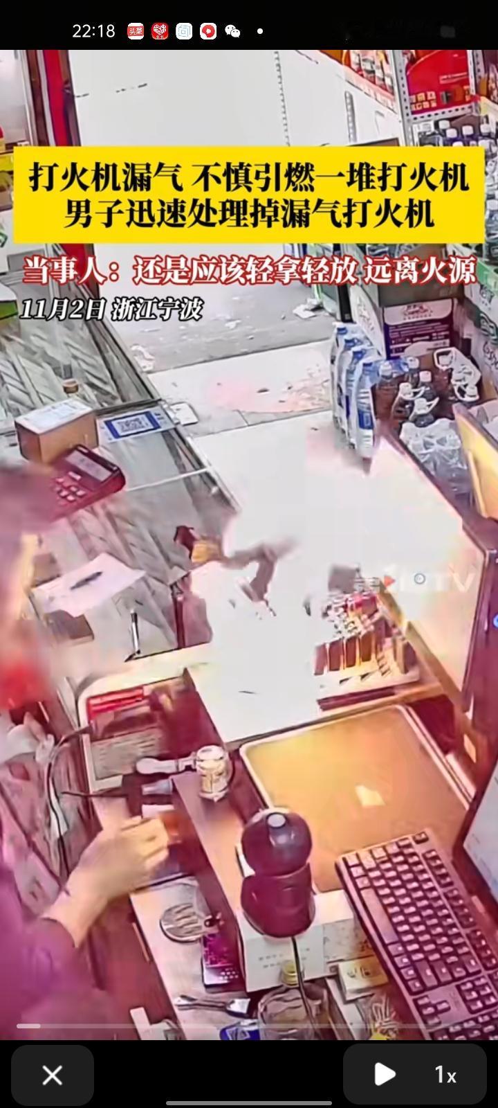 11月2日,宁波慈溪市。男子把火机随手一放,抽一根烟,火机就冒火了,波及到旁边的火机。好在他反应及时,把火机扔掉了。当事人吴先生表示,可能火机质量不是很好,气漏了,有滋滋响声,凑近一看可能就把打火机引来了。心想赶紧把火源解决掉,哪个冒火就把它处理掉。事后有点慌张,火机是从网上买的,质量真的不太好。
