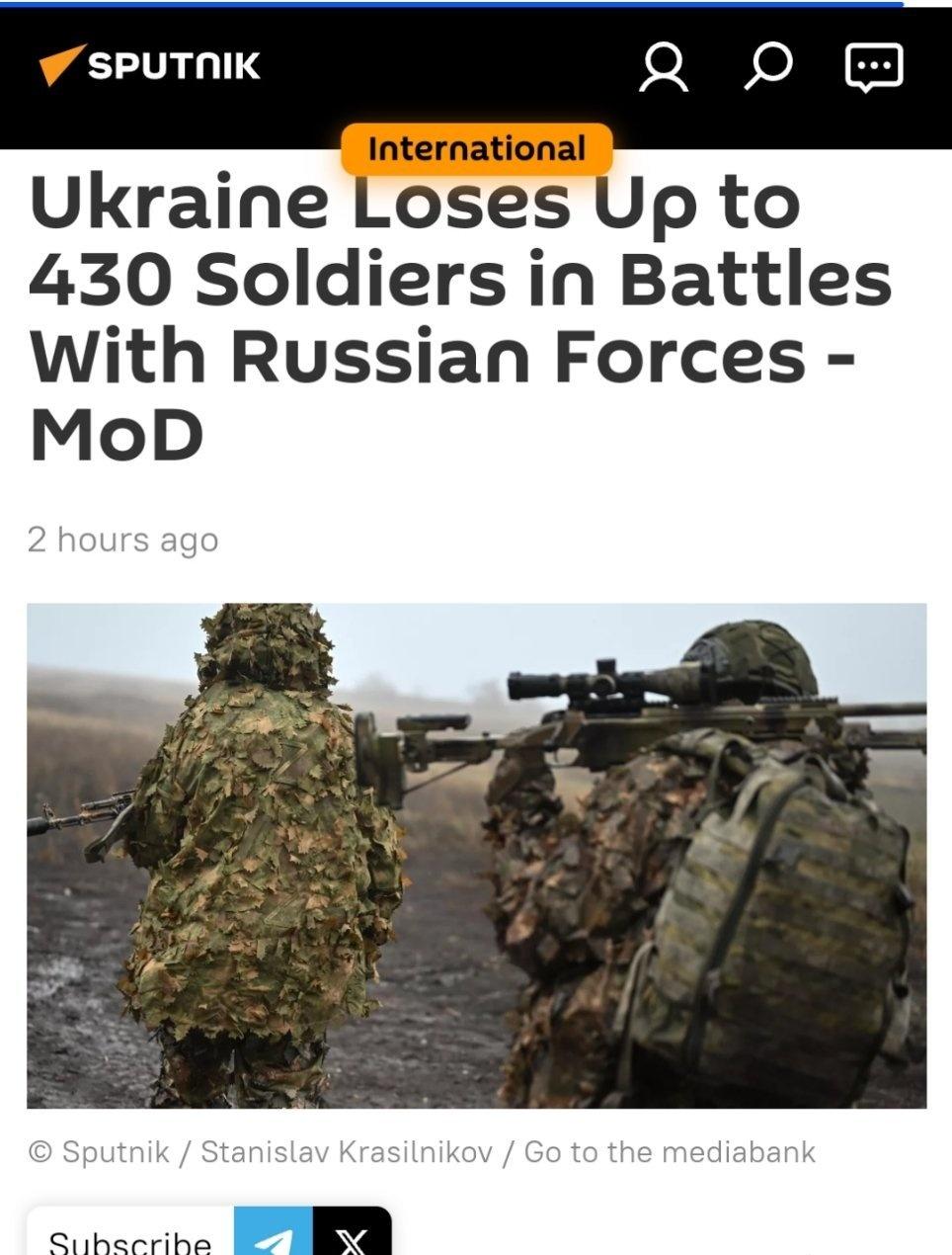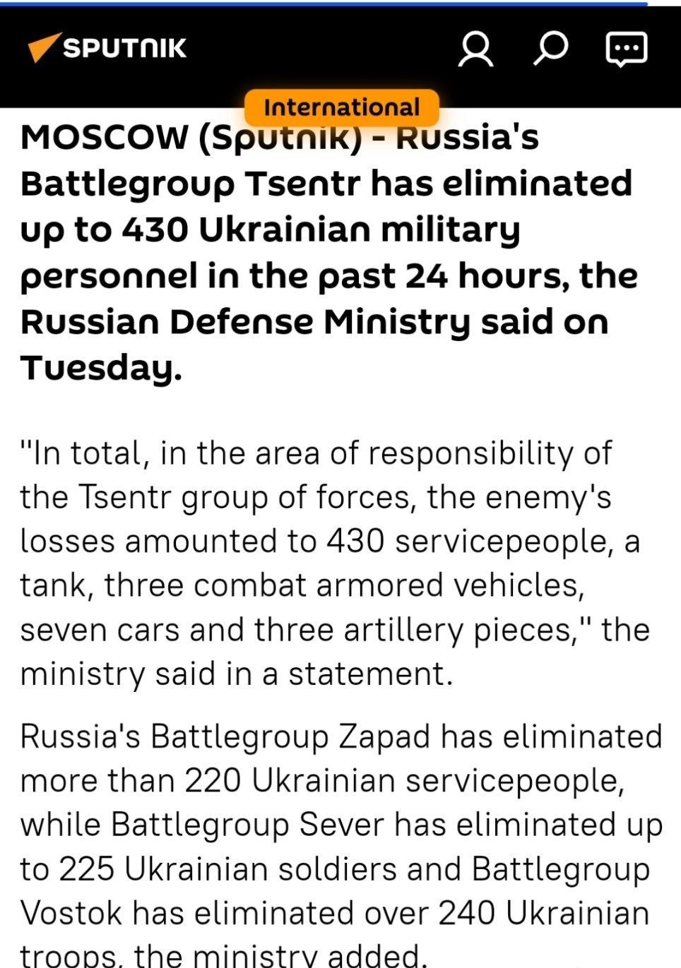 乌克兰在与俄罗斯军队的战斗中损失多达430名士兵- MoD 国防部在一份声明中说:“在Tsentr部队负责的地区,敌人总共损失了430名军人、一辆坦克、三辆战斗装甲车、七辆汽车和三门火炮。” 俄罗斯国防部补充说,俄罗斯的“Zapad”战斗群消灭了220多名乌克兰军人,“Sever”战斗群消灭了225名乌克兰士兵,“东方”战斗群消灭了240多名乌克兰士兵。 国防部在一份声明中说:“防空系统击落了三枚制导航空炸弹,一枚美制HIMARS多管火箭发射系统导弹和204架飞机型无人机。” 此外,俄罗斯武装部队还破坏了支持乌克兰国防工业综合体企业运营的能源和运输基础设施 (俄罗斯卫星通讯社国际版)