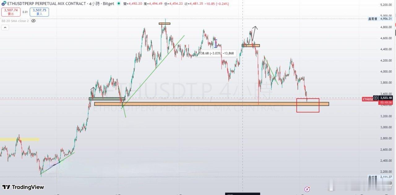 今天晚上以太重點關注3390 - 3440區間的支撐,這裏一旦跌破,場面就很難想象了