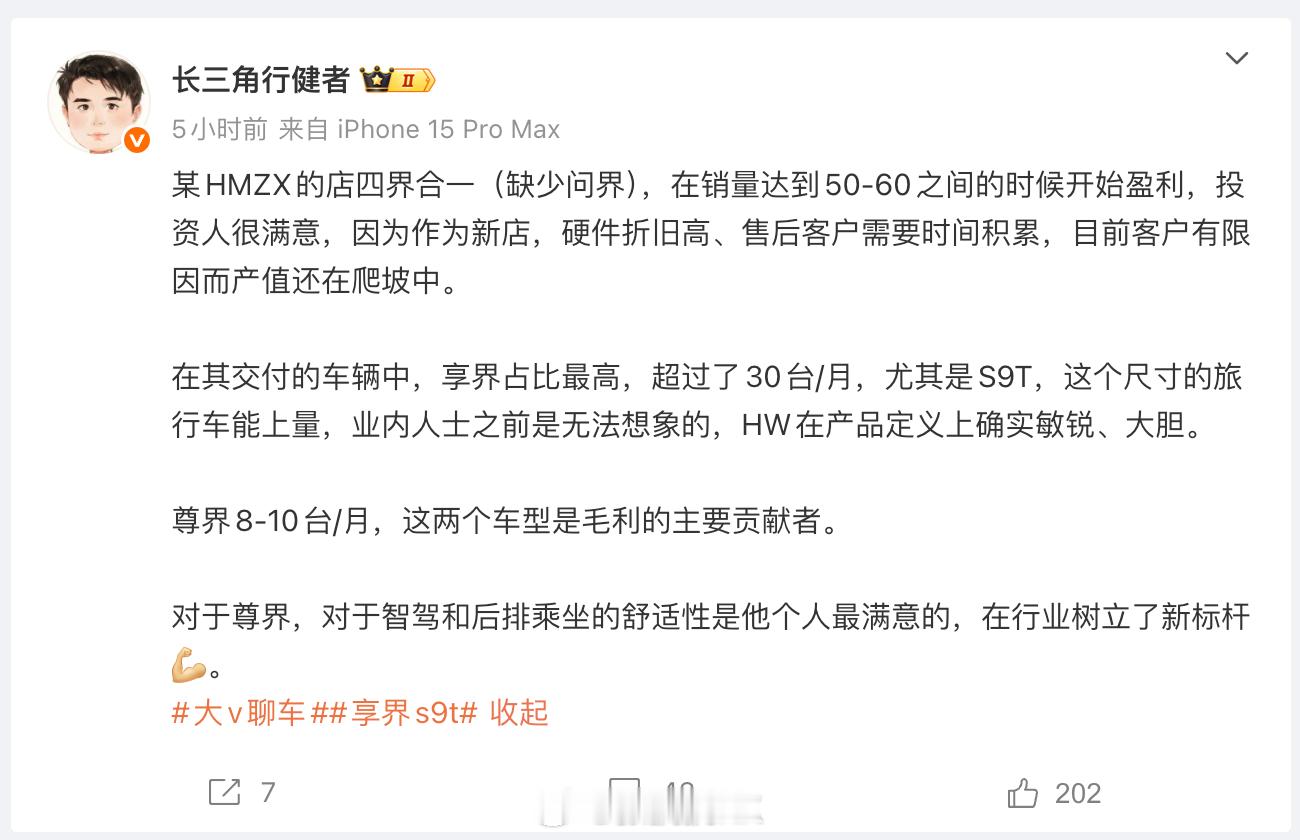据述:在鸿蒙智行店中,除问界外享界占比最高,超过了30台/月,尤其是S9T,这个尺寸的旅行车能上量,业内人士之前是无法想象的,HW在产品定义上确实敏锐、大胆。