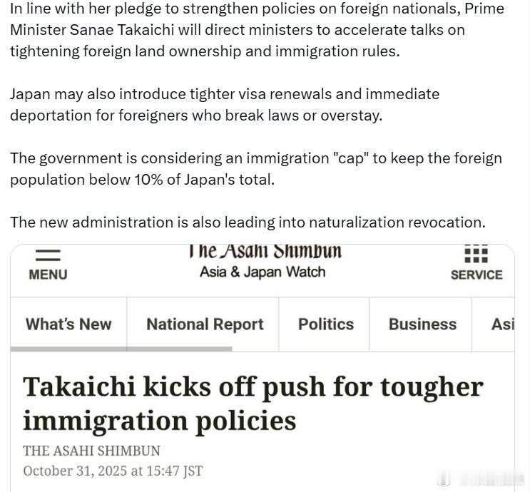 为兑现其加强外籍人士政策的承诺,日本首相高苗将指示各部长加快收紧外国人土地所有权和移民规定的讨论。