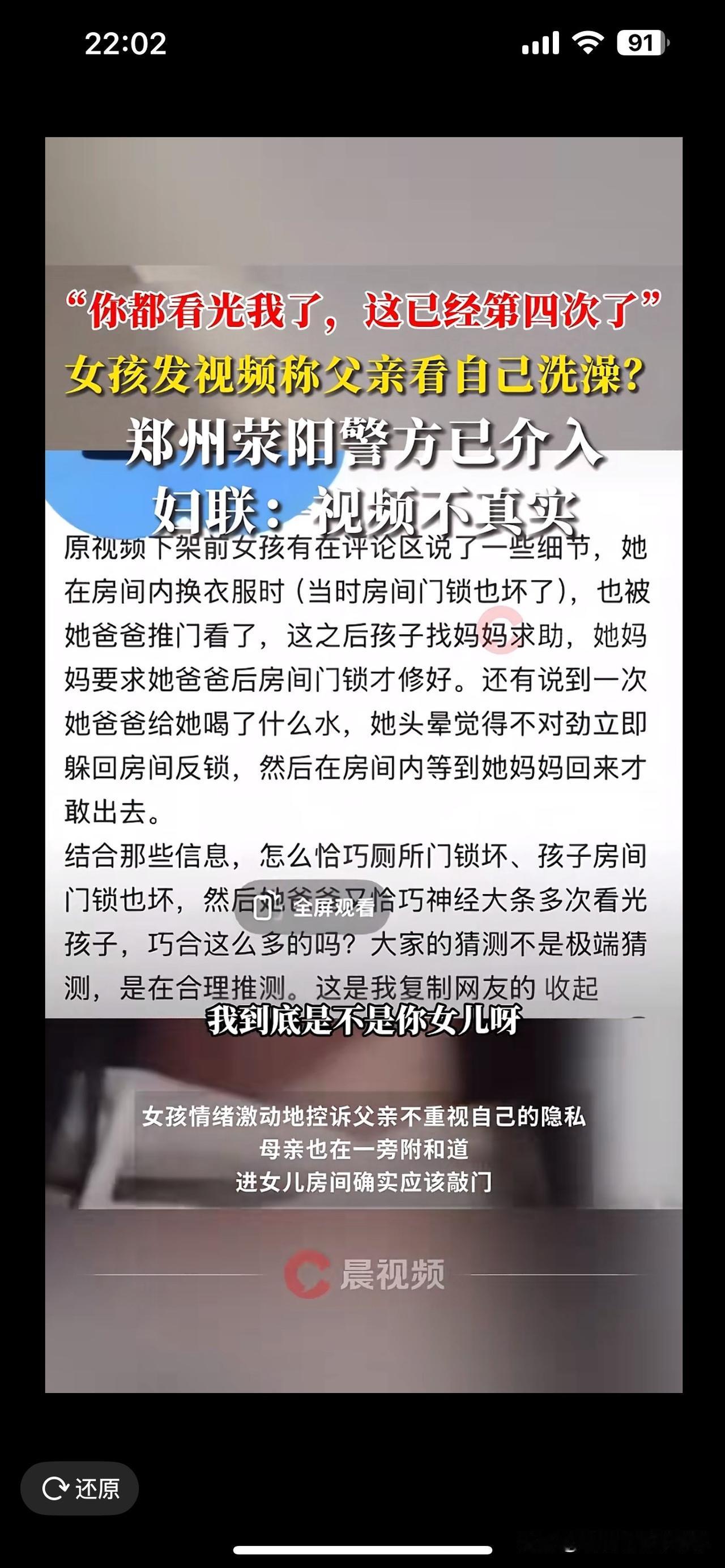 河南荥阳有一女孩儿哭到崩溃,情绪激动说父亲4次没敲门闯进浴室偷看自己洗澡,导致自己的隐私被看光,女孩还委屈的告诉父母,父亲碰她一下都感到恶心,而且母亲还帮腔。 父亲暴怒的画面让全网的网友都替该女孩儿捏了一把汗。直呼其父亲的行为必须严惩, 结果呢,视频发布不久就被删除,这也引发了很多网友的好奇! 今天荥阳的妇联和警方一并介入啊,查到了真相,向这个一家三口证实该视频内容完全不真实。而且视频的发布者也悄悄的删除了视频, 要知道,拿家庭隐私编故事、播流量,真的是毫无底线,这样 不仅仅消费了网友的同情心,搞不好还涉嫌违法犯罪。所以帽子叔叔后续的调查还在进行。 网友们还是理性看待吧.,真的没有那么多阴谋论, 当时的诬陷蛋糕店猥亵儿童、地铁偷拍、小慧君 各种各种 ,现在的新闻 ,理性看待 ,调查结果没出来之前 ,不要被带着跑了!妇联已介入,了如果是真是的情况,妇联不会向着女孩父亲说话的! 无脑的傻子出门要带上脑子,网上的东西看看就好。现在想火的人太多了。,有啥问题直接去找帽子行了,这里也不是法官和公安!