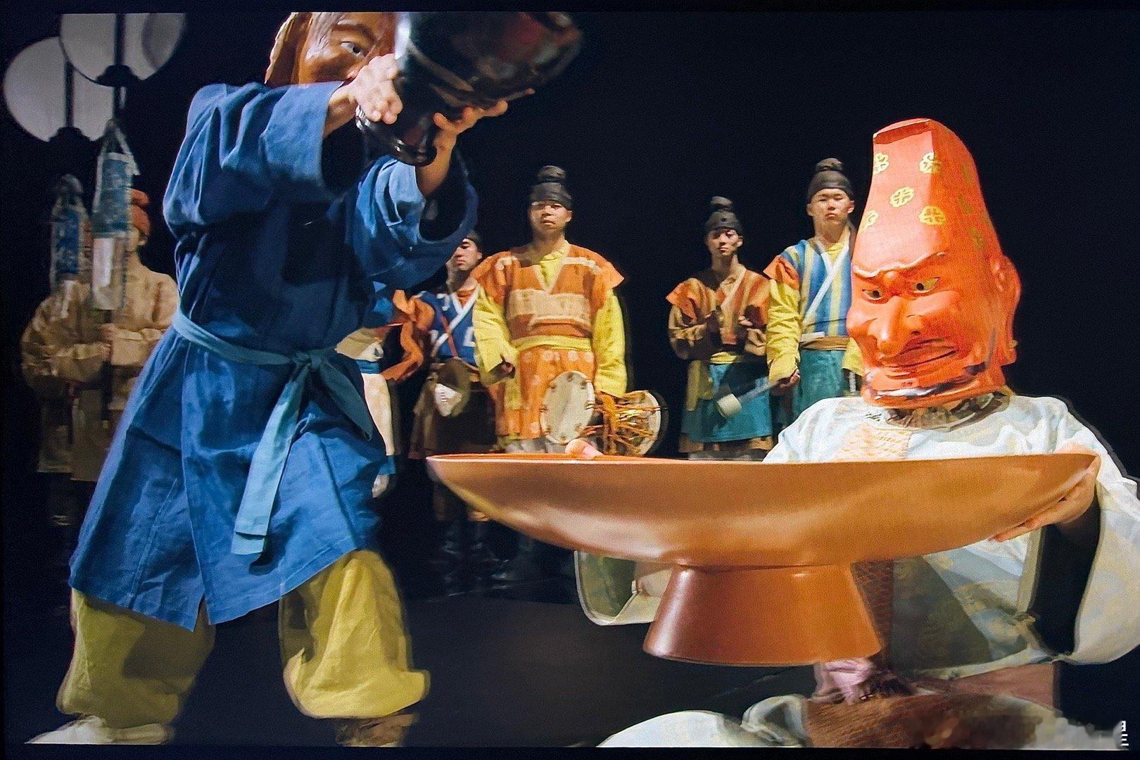 图8是我很喜欢的展示:古代伎乐复原。这是百济人味摩之从南梁学到后,再传入日本的中国戏曲。完整版的伎乐早已失传,研究复原版这也是第一次看到。