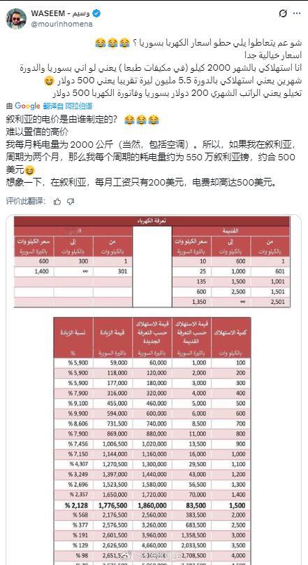 叙利亚人抱怨HTS政权大幅度提高电费,不过他说的也不是很准确,首先是一般叙利亚家庭冬季取暖一个月用不了2000千瓦,其次绝大部分叙利亚人的月收入也到不了200美元。